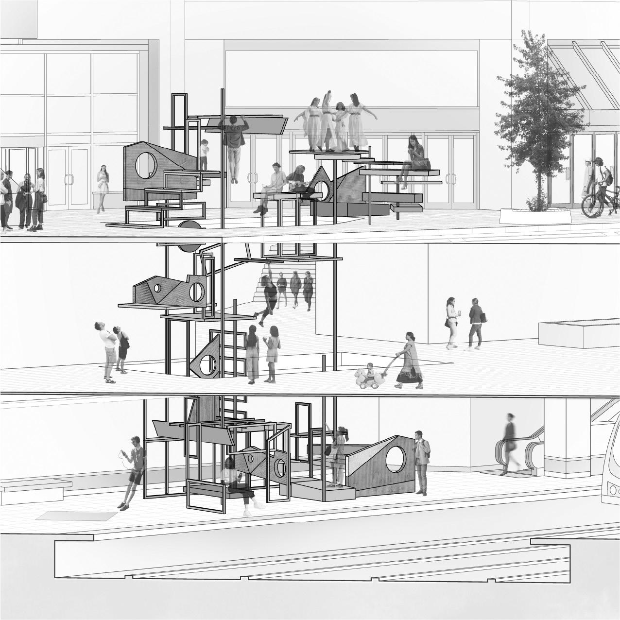 Shapes of Engagement explores how ambiguous, modular forms can strengthen connections in Toronto’s fragmented neighborhoods. Informed by community responses to questions like “What shape makes you want to relax?” each design is tailored to local contexts. By playing with scale, orientation, and spatial arrangement, these forms invite a range of interactions—rest, play, gathering—shaped by each community’s identity. Placed within niche, underutilized public spaces, they transform the interstitial into the intentional. Collectively, the designs form a polycentric network that enhances both local cohesion and broader urban connectivity, using form as a tool for social interaction, place-making, and belonging.