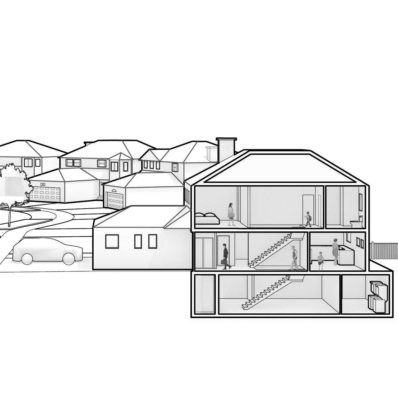 My research challenges the conventional single-family home by proposing a more adaptable multigenerational housing model tailored to the lived experiences of Chinese immigrant families. This model not only preserves cultural continuity but also offers economic benefits and redistributes essential household functions—such as childcare, elder care, and domestic labor—through mutual support across generations. While multiplex housing is gaining traction, it often lacks the communal spaces that foster intergenerational bonding. My proposal envisions a more flexible typology, where units remain accessible yet separable, enabling both shared living and individual retreat. Inspired by collectivist Chinese values, this design redefines suburban housing to support evolving family structures, reinforcing interdependence while maintaining a balance between shared and private spaces.