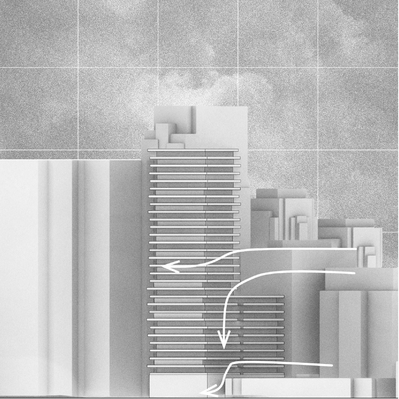 Catalyzed by one of Toronto’s urban wind tunnel effects, this research aims to improve pedestrian comfort by altering the geometry of high-rise towers. The study examines three types of towers: those that harness wind, divert wind, and disregard wind in their design. Using computational fluid dynamics analysis, I identified the optimal tower geometry to minimize wind tunnel effects in urban settings. However, since demolishing and rebuilding cities isn’t feasible, I propose a design solution that serves as an integrated façade to the catalyst building to mitigate the issue, thus offering an adaptive strategy to enhance urban wind conditions.