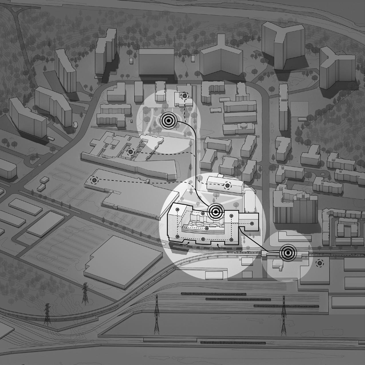 Public Circuit is an urban design public space network proposed for Toronto’s Little Jamaica neighborhood. The project articulated as a loop with a series of interconnected nodes aims to provide a network of multievent spaces for communities to gather, connect, and engage in shared experiences. Each node is anchored and builds on services offered by existing community stakeholders. The spaces envisioned are intended to be versatile and multi-functional, offering various amenities, including flexible seating arrangements, performance stages, interactive public art installations, markets, and parks. These spaces investigate the potential of strengthening social connections as a means of preserving and enhancing neighborhood identity.