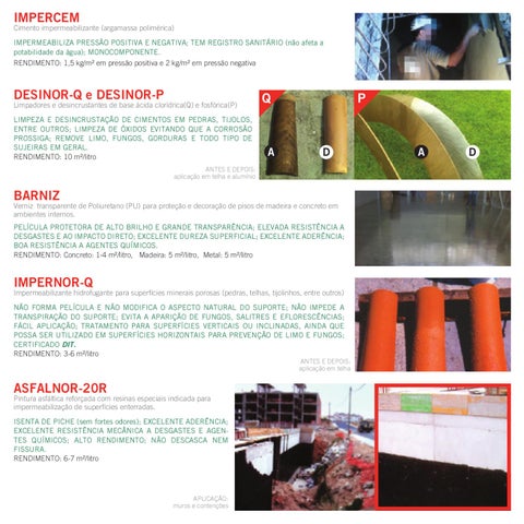 Limpadores e desincrustantes de base ácida clorídrica(Q) e fosfórica(P) LIMPEZA E DESINCRUSTAÇÃO DE CIMENTOS EM PEDRAS, TIJOLOS, ENTRE OUTROS; LIMPEZA DE ÓXIDOS EVITANDO QUE A CORROSÃO PROSSIGA; REMOVE LIMO, FUNGOS, GORDURAS E TODO TIPO DE SUJEIRAS EM GERAL. RENDIMENTO: 10 m²/litro