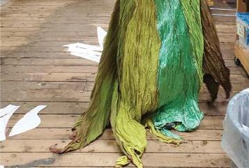 A range of techniques was used to create the Monster’s petals. The dyed fabric was heated in a microwave to create an organic texture. The material was cut along custom stencils designed for the Monster’s body. The fabric was sewn together and given rigidity with wire. Faux vegetation was added to provide another layer of visual texture.