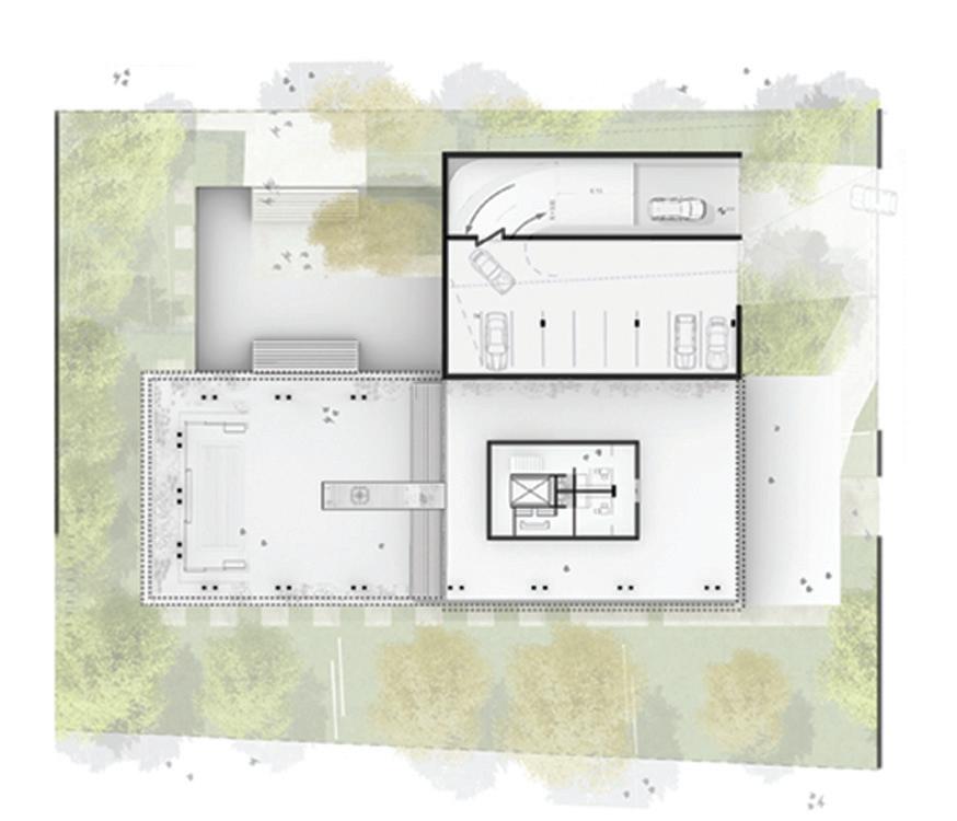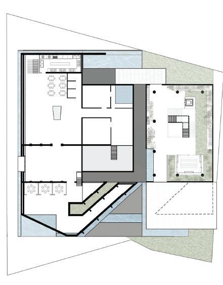 The greenhouse is located in the public Western portion of the site, facing the residential and commercial areas. Public access would be placed in the lower floors of the greenhouse as well as the outdoor pavilion.