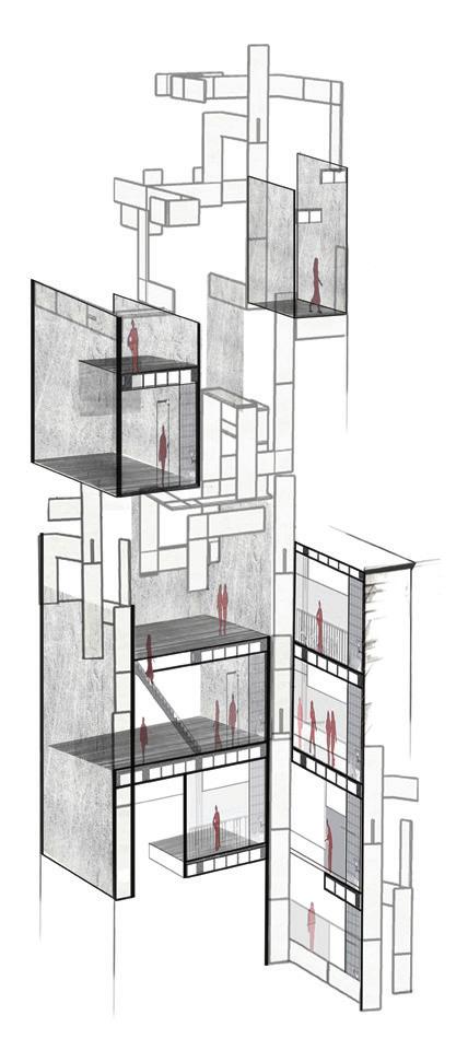 As time progresses, inhabitants move upwards into more private rooms with views of the surrounding city and direct connections to other programs, such as the offices and the Greenhouse.