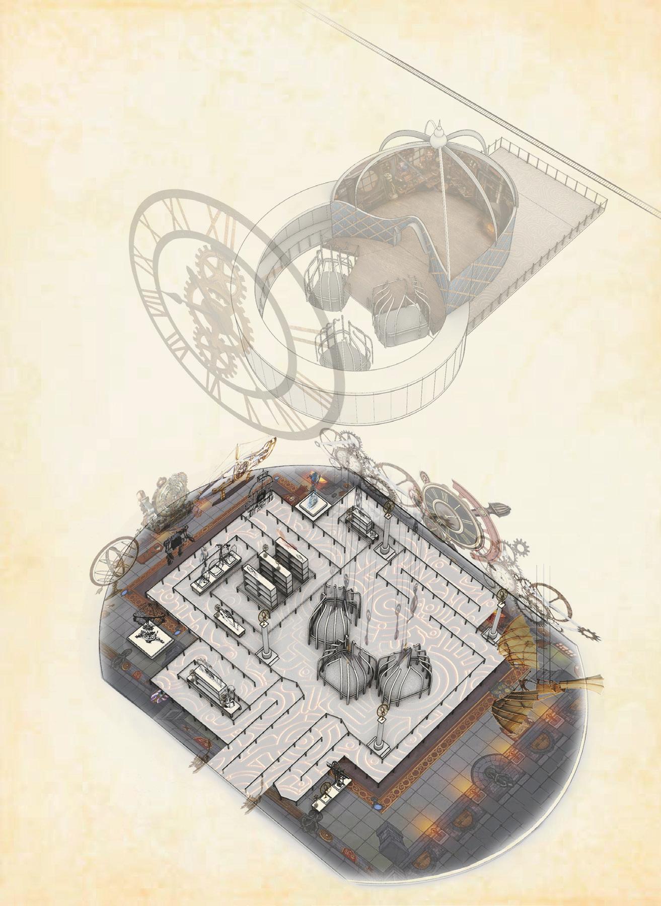 THe TimeLiNe riDe: Venture inside Tower Time to board the Timeline, a ride that enables you to travel through time alongside some of Timeworks’ most celebrated innovators and explorers. (Note: For the scope of this project, the Timeworks team will focus on the Timeline Ride queue. The story, engineering, and mechanical components of the ride itself will not be detailed here.)
