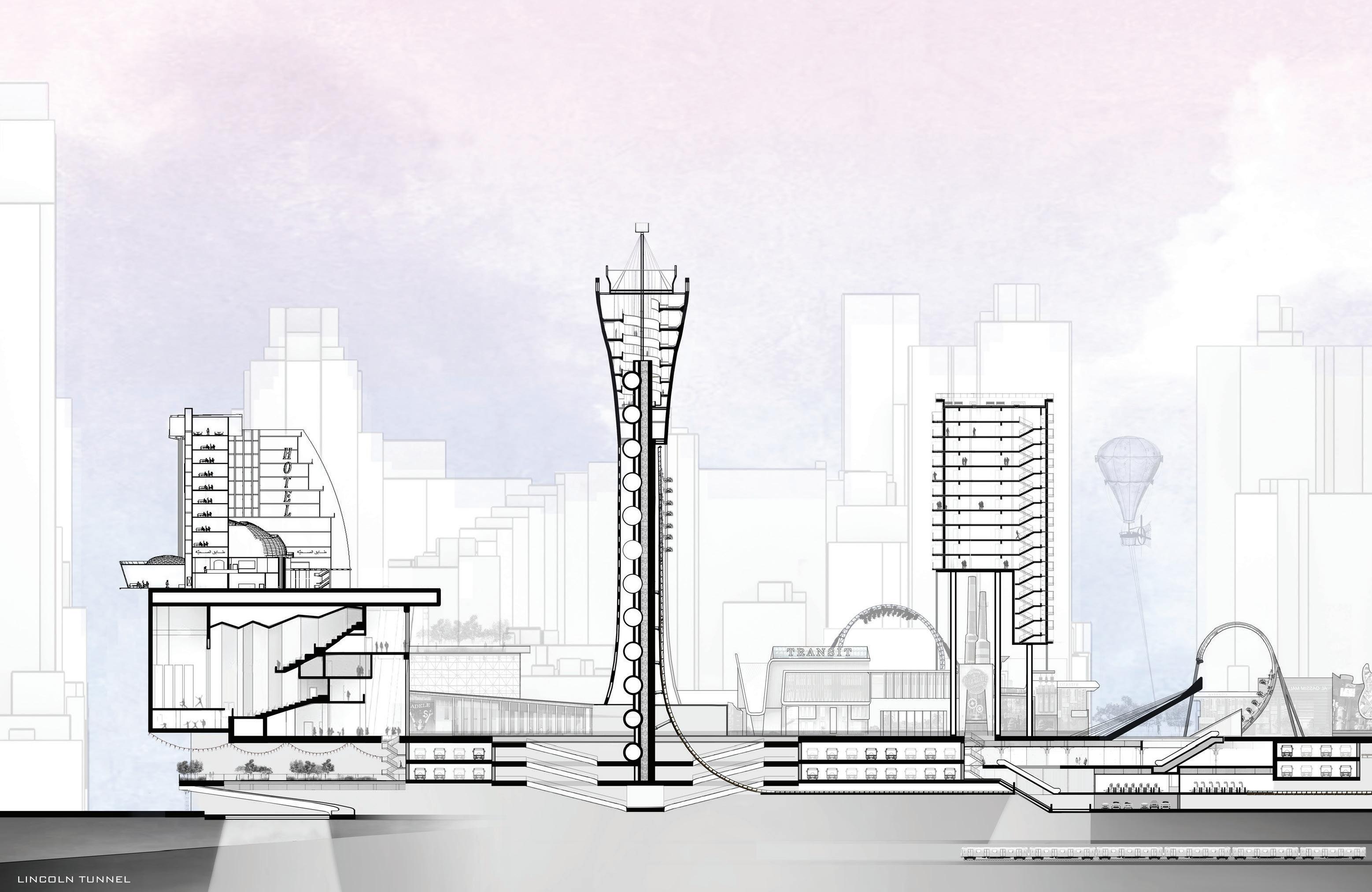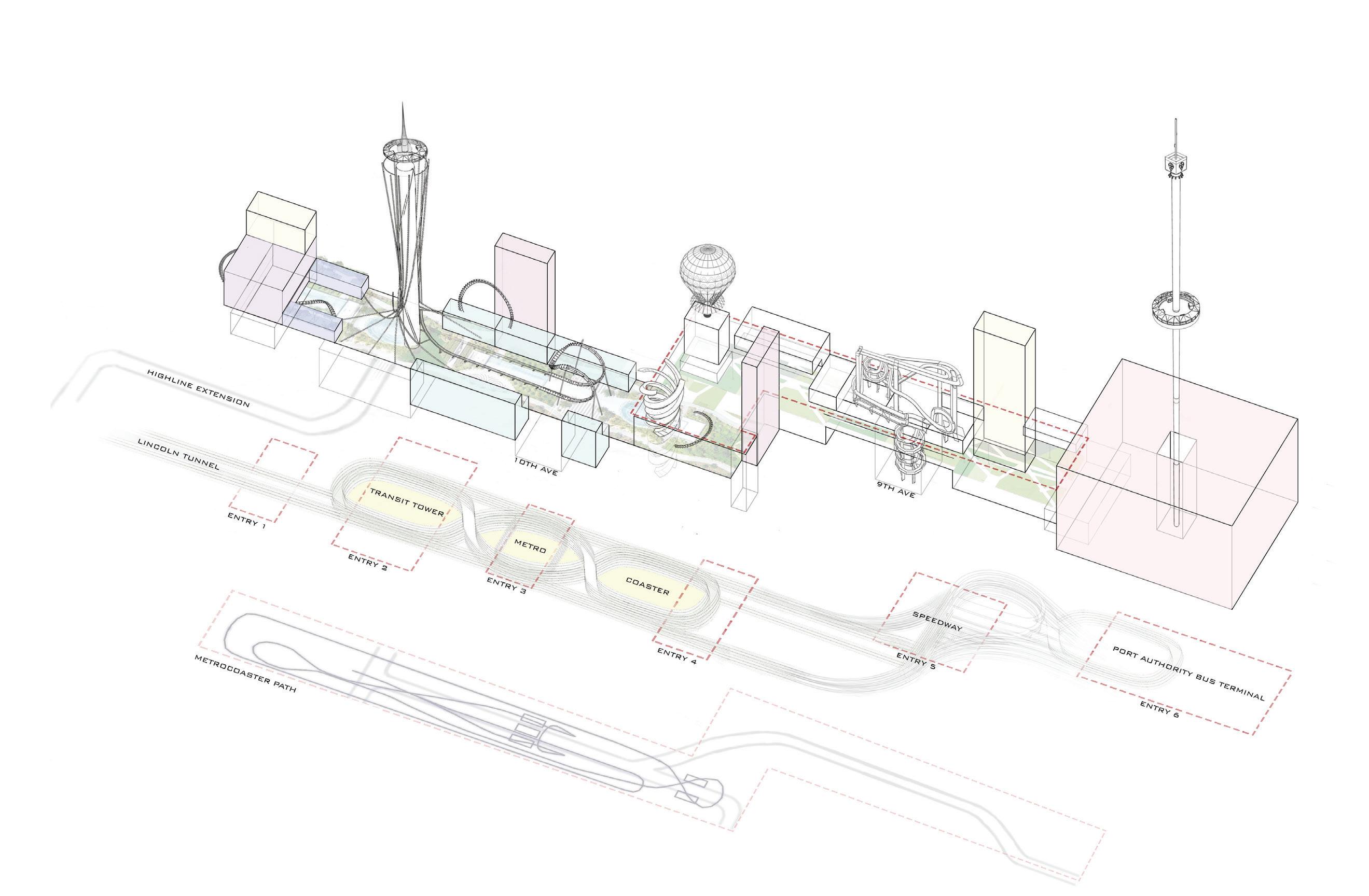 The site for this research project is the Port Authority Bus Terminal (PABT) in New York City. The Port Authority of New York & New Jersey (PANYNJ) has proposed to replace the existing PABT and supporting facilities, including the terminal and ramps. The replacement project is anticipated to utilize private development opportunities created by making PANYNJ land available to help fund the replacement project. However, this site has more potential to be an active and immersive environment since it is amid the active areas of the High Line, Hudson Yards, Javits Center, and Time Square. The research project will propose an urban theme park on land made available by the PANYNJ to celebrate transportation, help generate profit, and provide a one-of-a-kind urban experience.