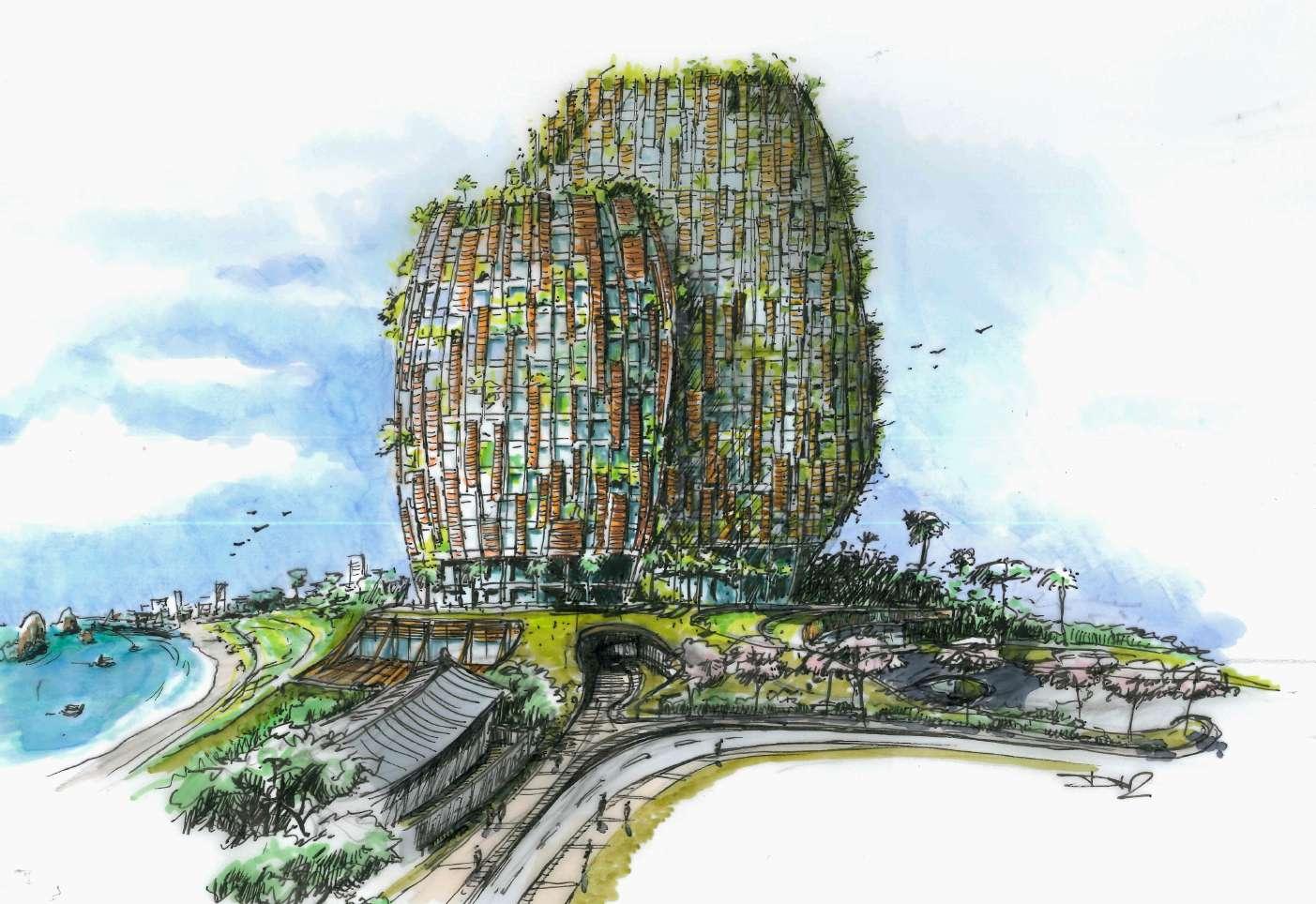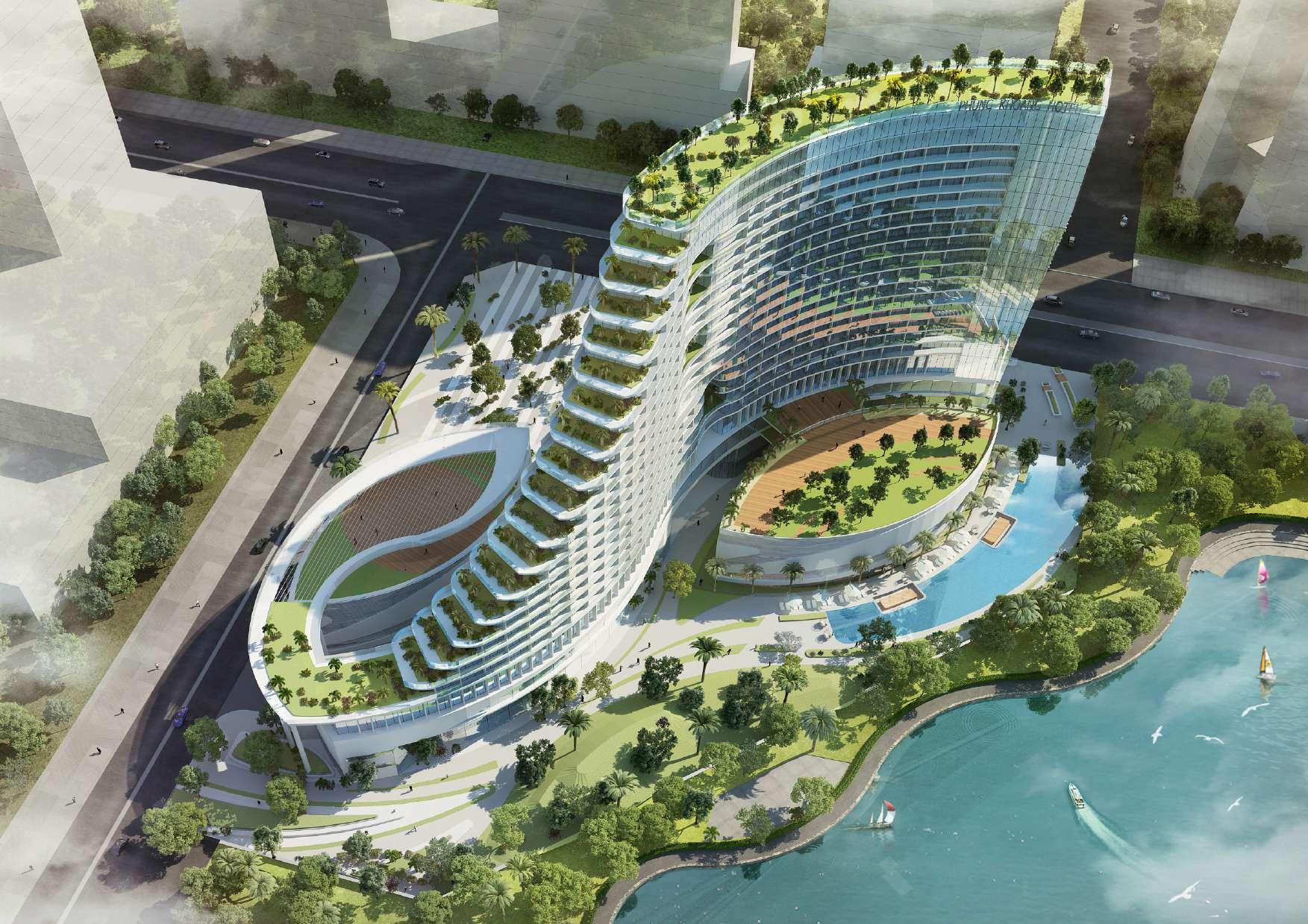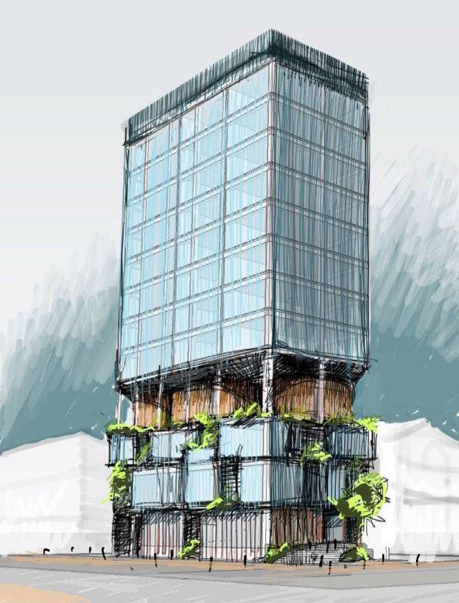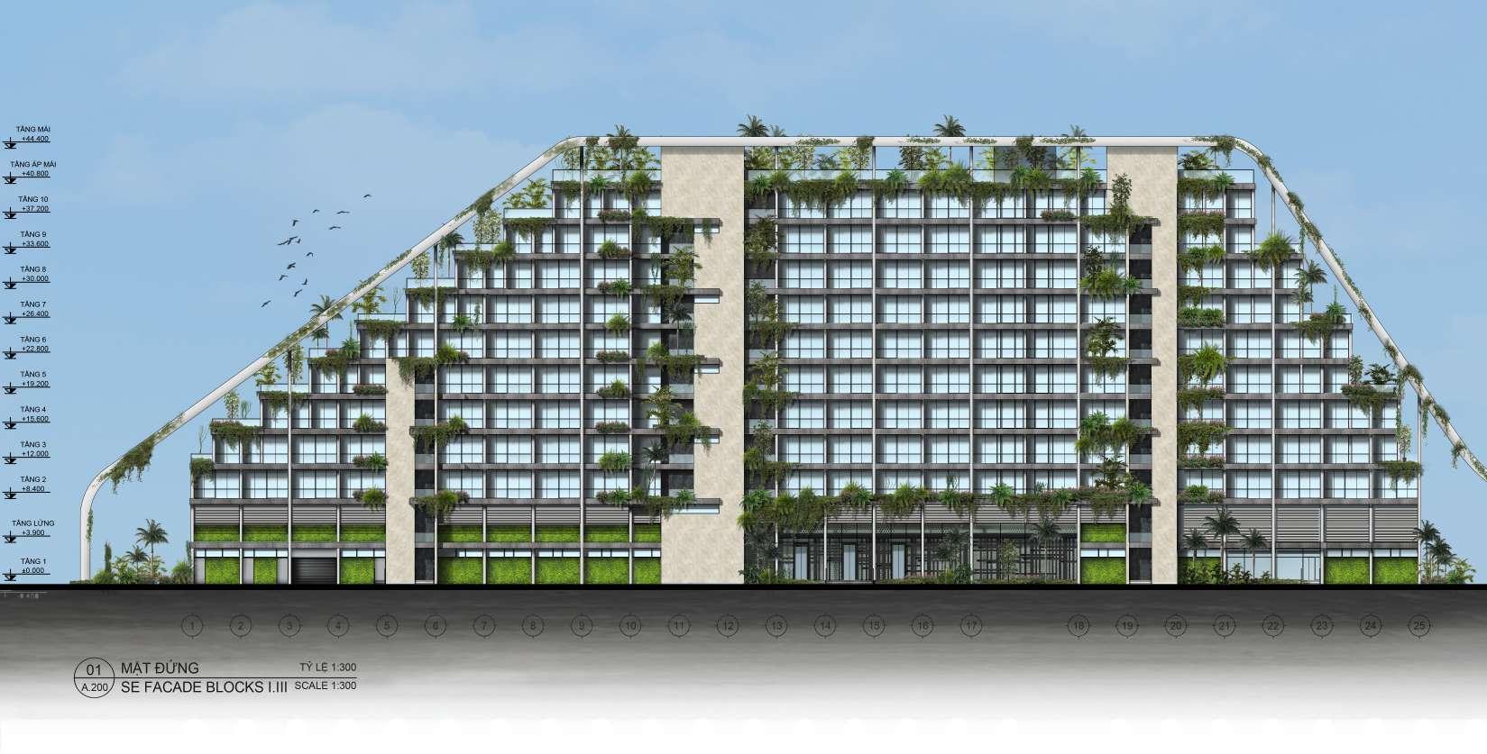 The lower body would represent the typical hanoian houses using as inspiration patterns and pockets of green that creep towards the facade, connected in the middle by a double height sky garden and feature restaurant, and an upper body, a curtain wall minimalist block