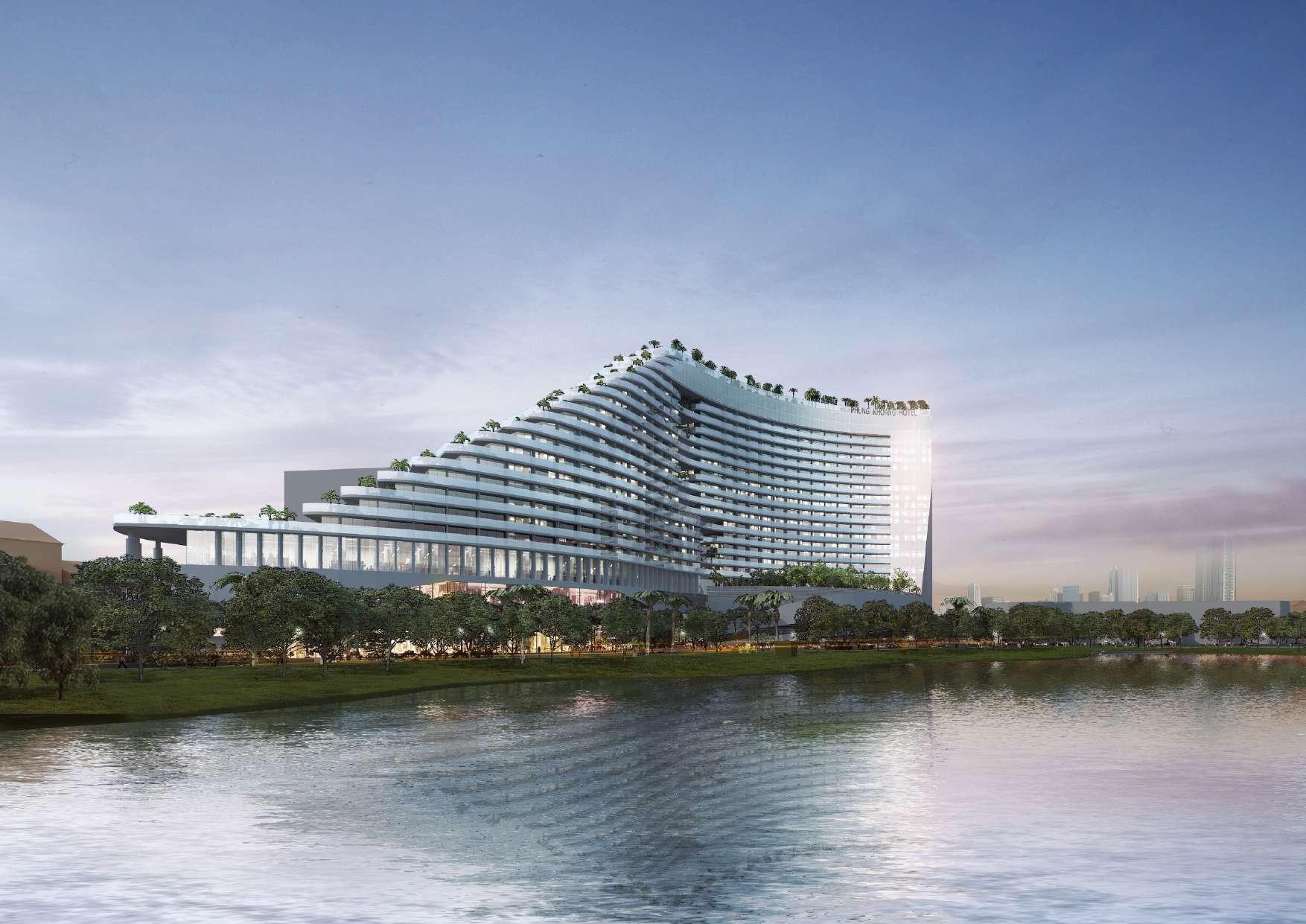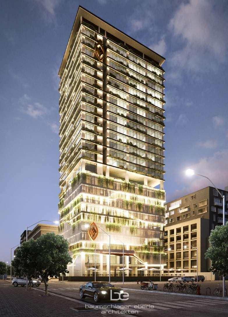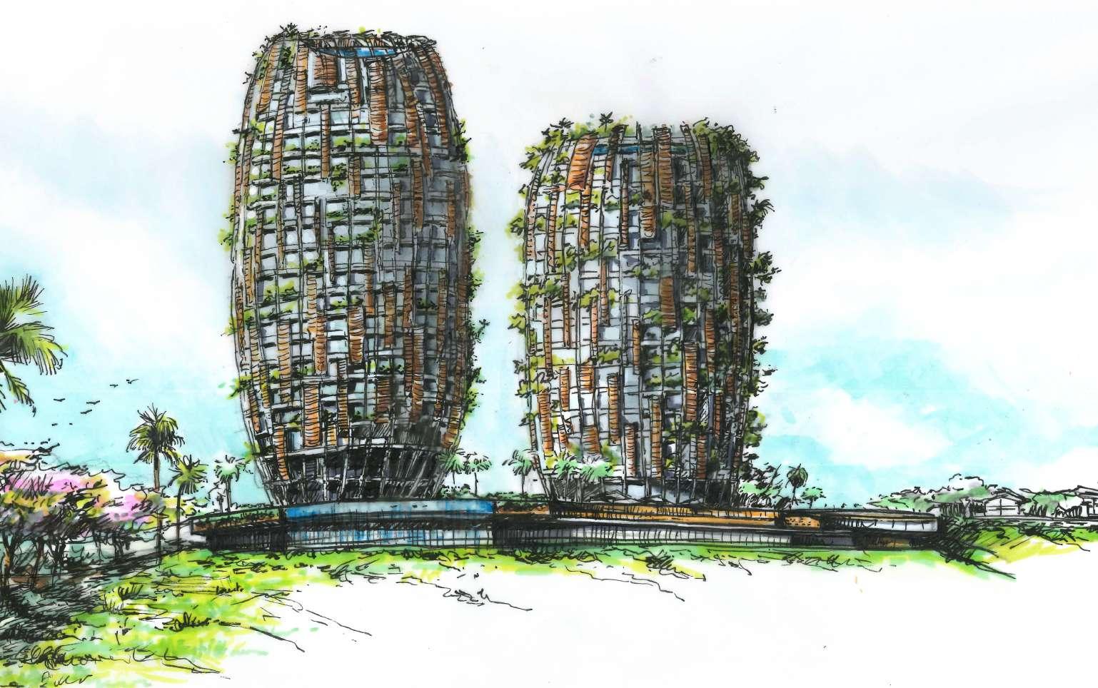 The lower body would represent the typical hanoian houses using as inspiration patterns and pockets of green that creep towards the facade, connected in the middle by a double height sky garden and feature restaurant, and an upper body, a curtain wall minimalist block