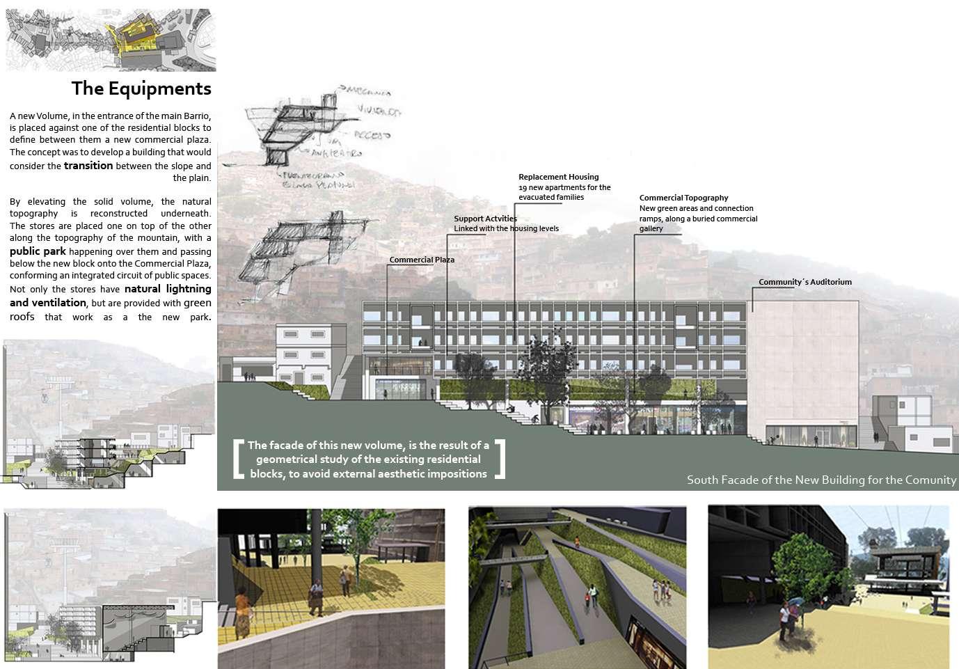 4. Five Multi-Use Volumes Permit the transition between the steep hill and the horizontal plain of the city, conforming at the same time new entrance facades to the “Barrios”, with commercial stores, parks and residences.