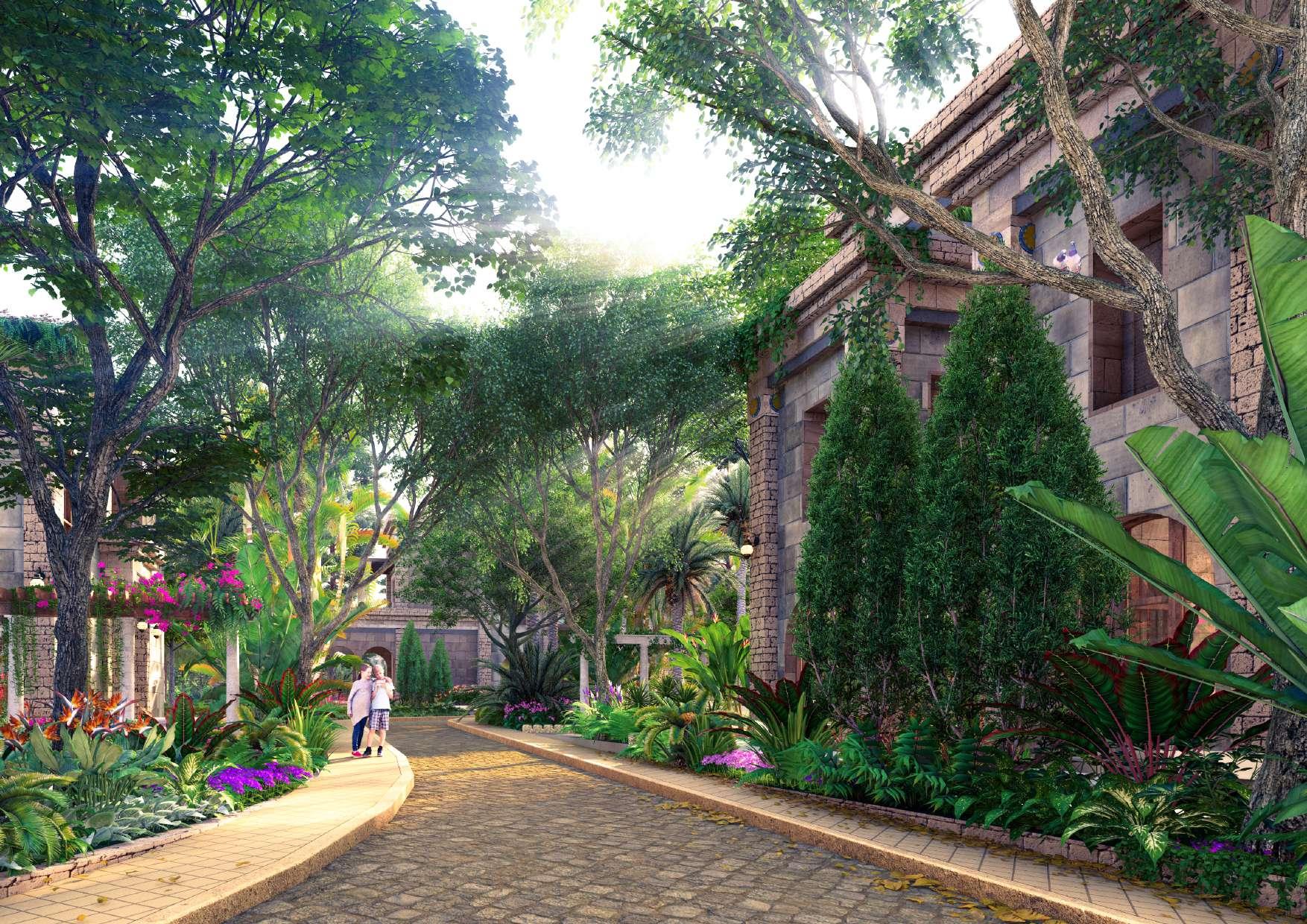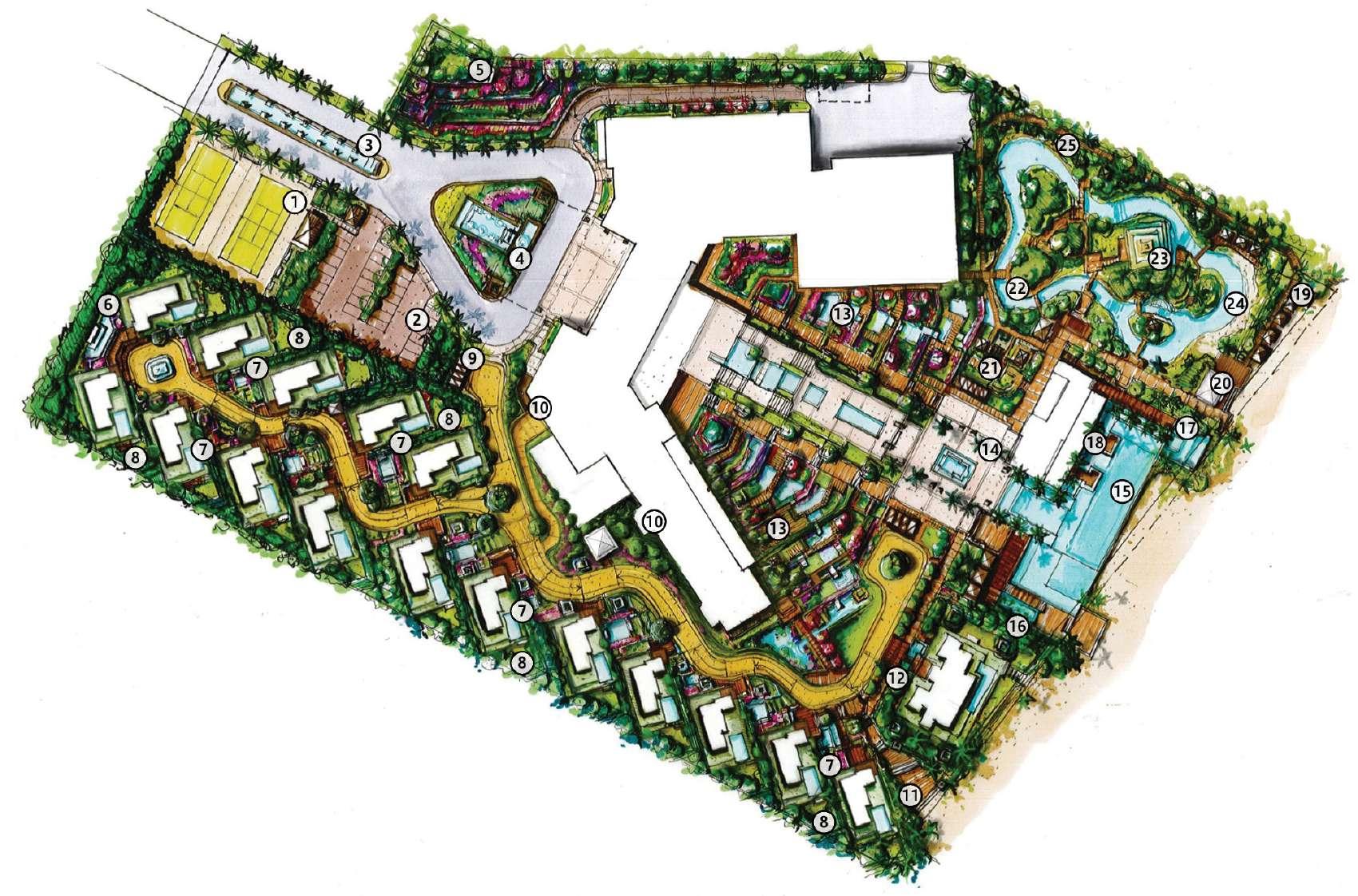 On the top of the hill above the villa's area sits a golf court hill and a belvedere that completes the circuit of the users of the resort and the golf court. The dense vegetation of this area allows the villas to have a high level of privacy from the upper terraces, but designing them in a way that each unit will also have long views to the bay.