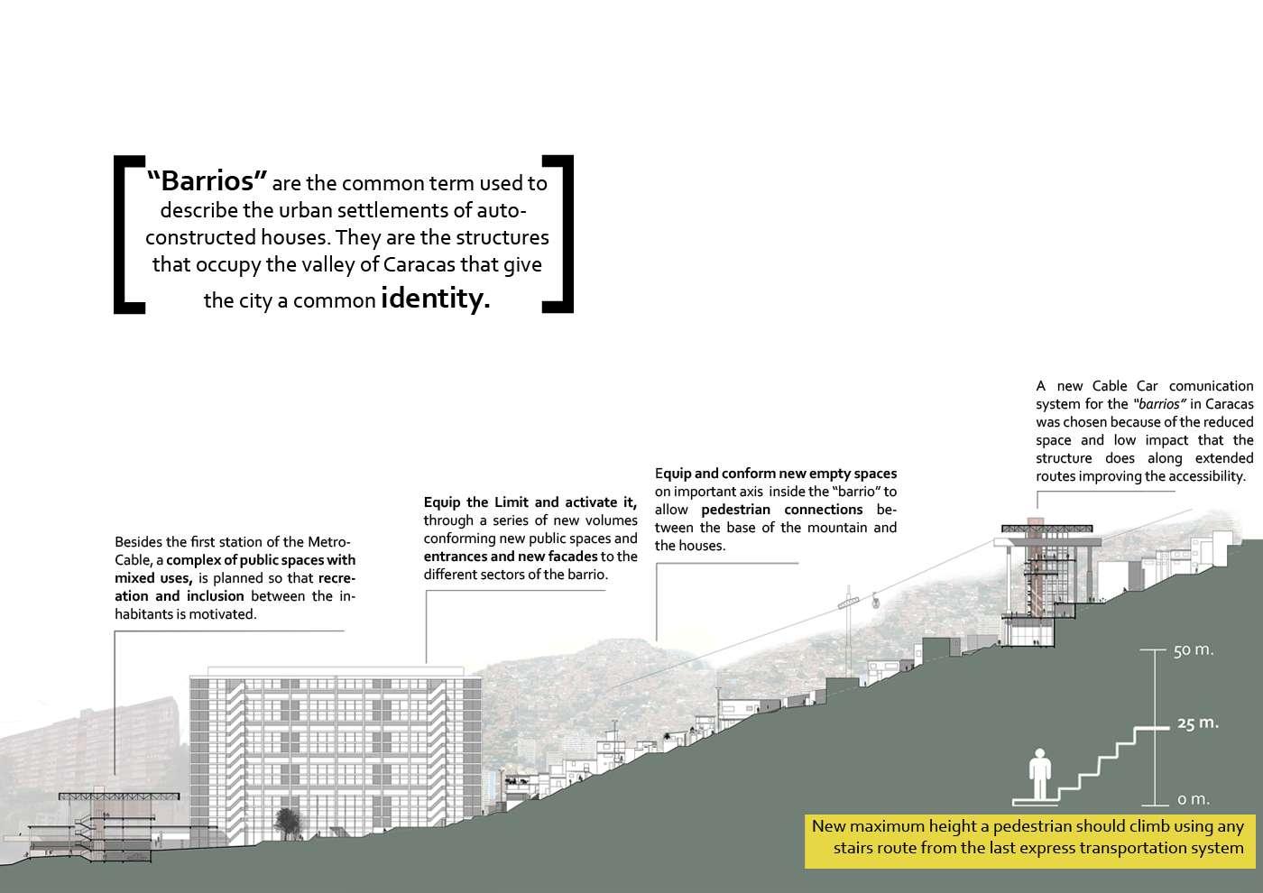 The interest for this subject, emerges as a long time citizen of Caracas, a fragmented city victim of a constant lack of planning, and the ideal to give or discover in a proper city’s identity, understanding the qualities of the Urban Limit and its roll in modern Latin American cities.