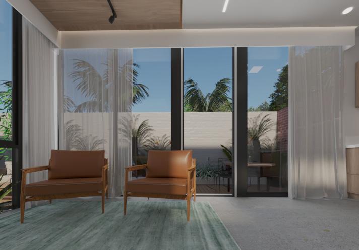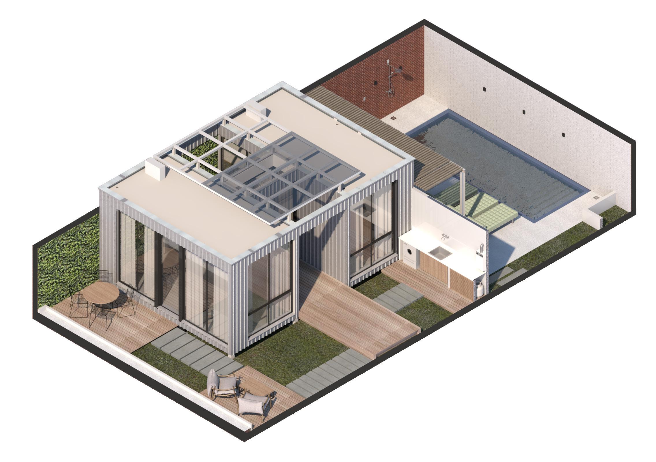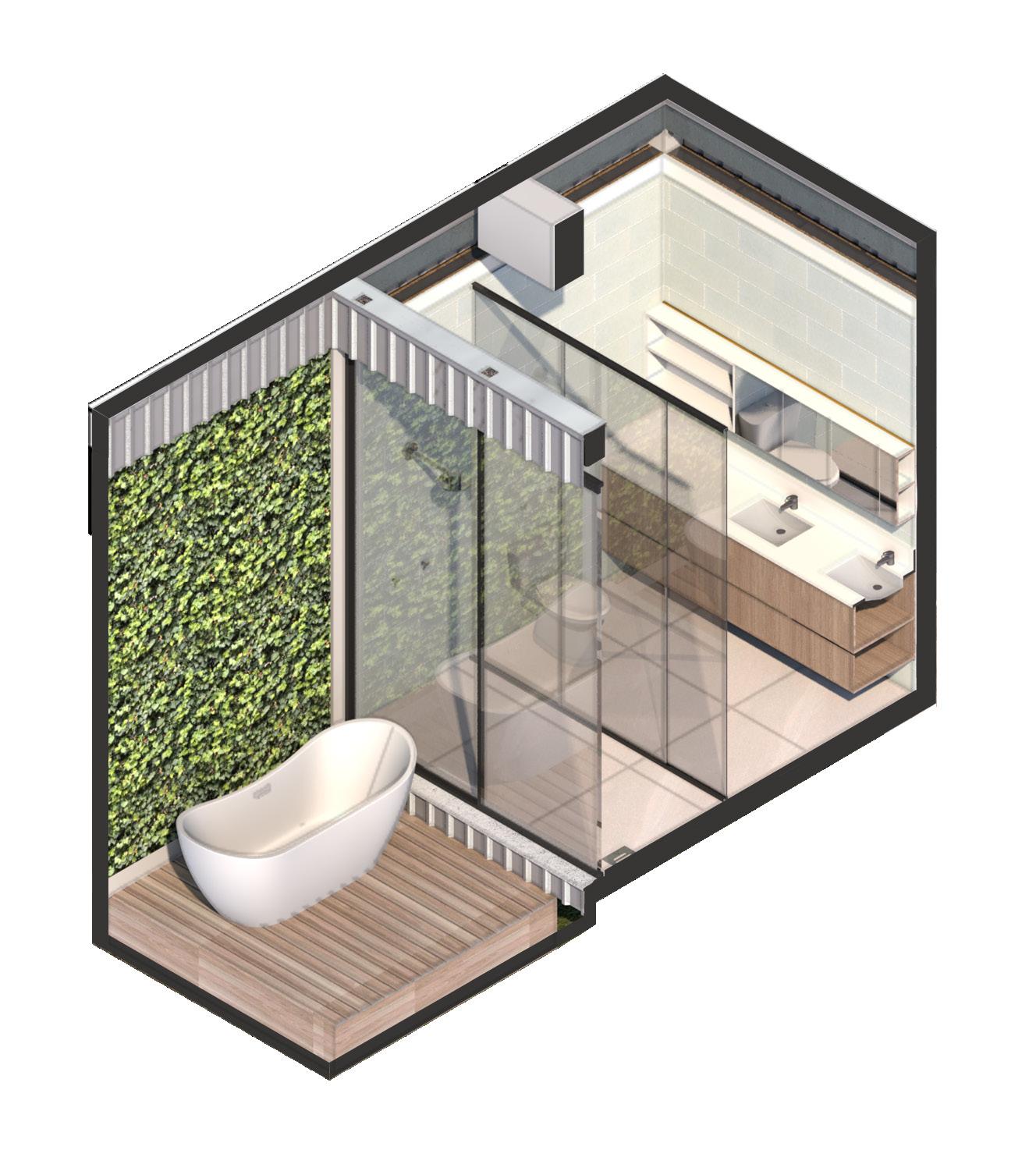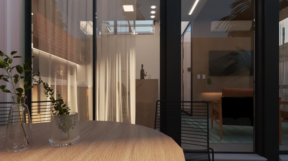 O partido é entendido por dois volumes retangulares simétricos - íntimo e social- , ligados por um corredor e uma cobertu ra metálica leve, resultando em uma subtração que garante iluminação e ventilação, junto de um espaço lúdico e com forte presença do verde como uma extensão do banheiro para atra ção do Airbnb. O deck centralizado marca o acesso principal do anexo. A zona social possui conexão direta com a área externa, como, também, sua extensão. O mobiliário segue paleta neutra, com pontos específicos de cor, valorizado a partir de uma ilumi nação adequada e atendendo às proporções e necessidades de um anexo com o propósito de abrigar 2 pessoas (casal).
