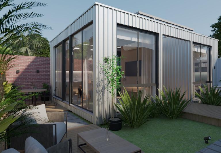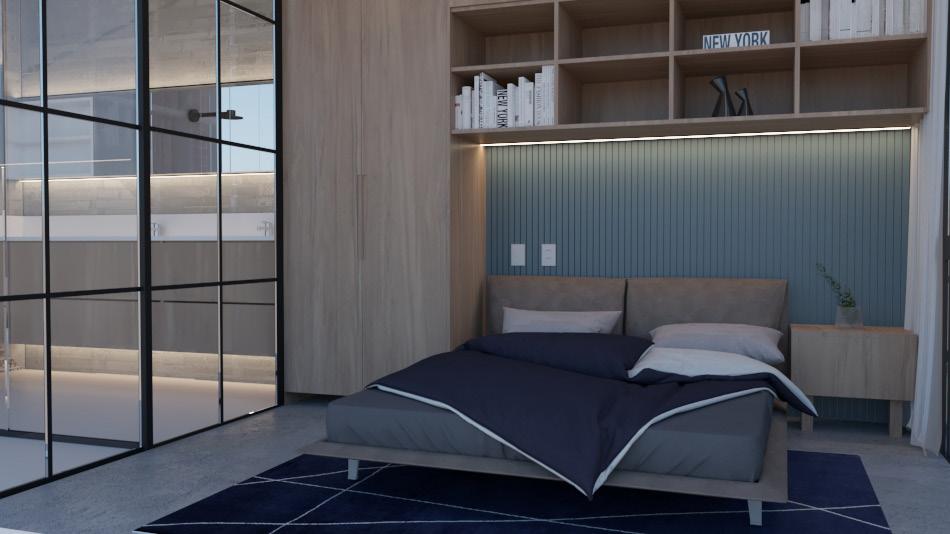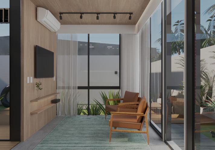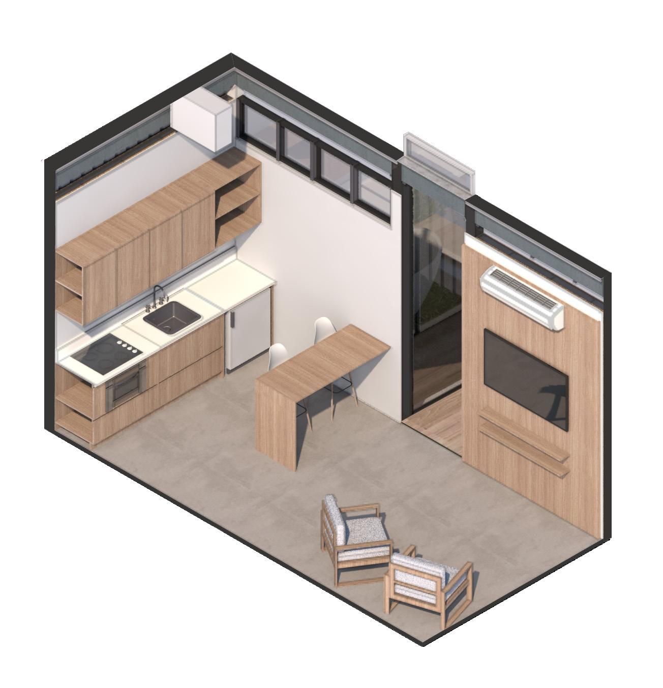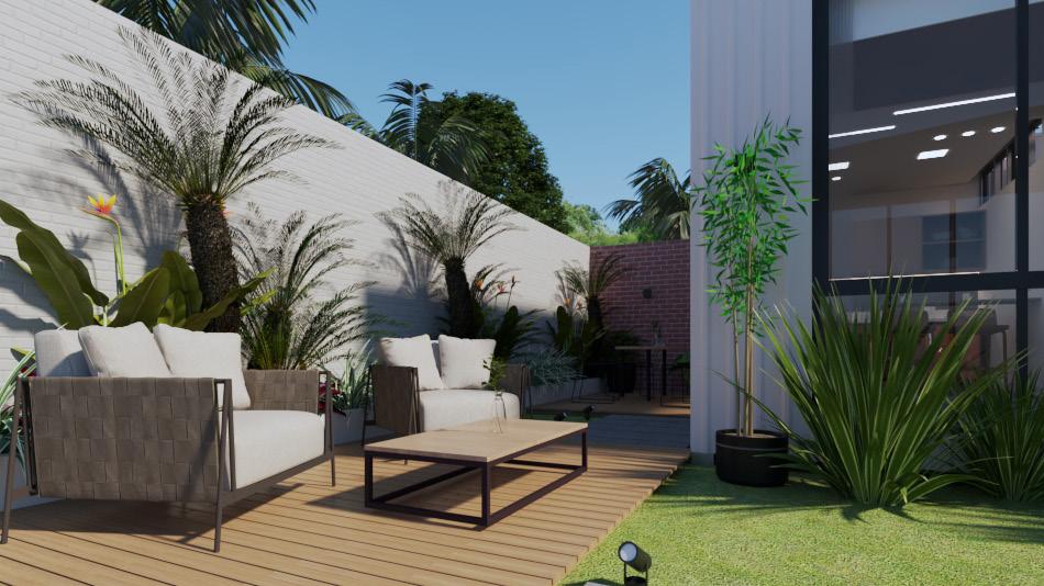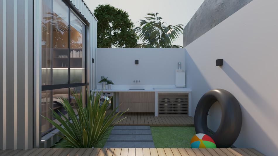 O partido é entendido por dois volumes retangulares simétricos - íntimo e social- , ligados por um corredor e uma cobertu ra metálica leve, resultando em uma subtração que garante iluminação e ventilação, junto de um espaço lúdico e com forte presença do verde como uma extensão do banheiro para atra ção do Airbnb. O deck centralizado marca o acesso principal do anexo. A zona social possui conexão direta com a área externa, como, também, sua extensão. O mobiliário segue paleta neutra, com pontos específicos de cor, valorizado a partir de uma ilumi nação adequada e atendendo às proporções e necessidades de um anexo com o propósito de abrigar 2 pessoas (casal).