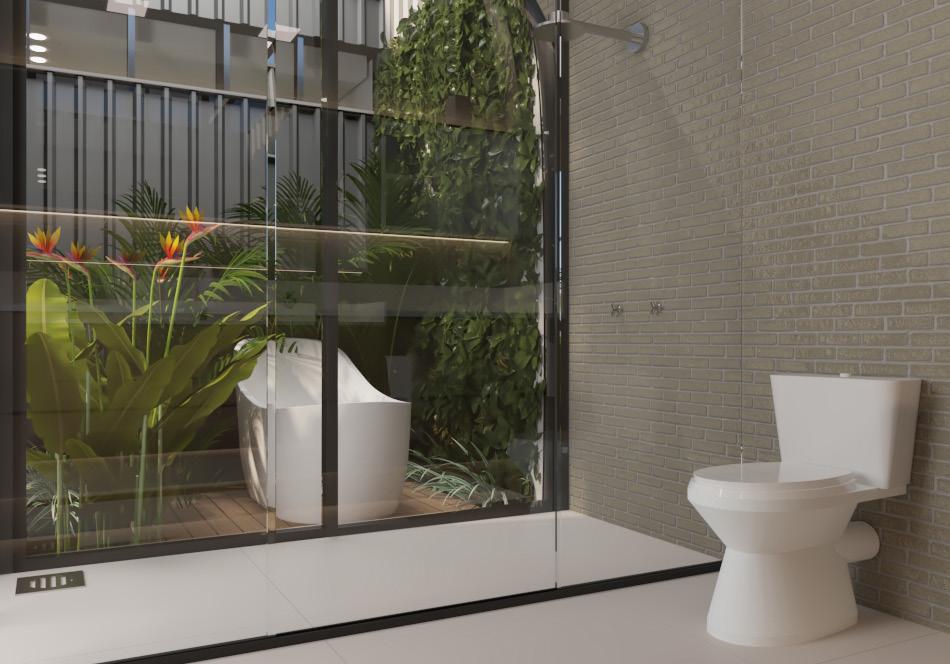 Os dois volumes retangulares simétricos foram posicionados de forma paralela e conectados por um corredor coberto por uma estrutura leve para setorizar as zonas social e íntima, ter uma continuidade da materialidade a partir do deck como entra da principal e conseguir maior iluminação e ventilação devido ao anexo estar posicionado nos fundos da casa. Pensado para um casal, o Airbnb impressiona pela conexão externa e interna com a natureza, tanto pela integração com a varanda, quanto pela banheira rodeada pelo verde, ao ar livre, como uma exten são do banheiro.