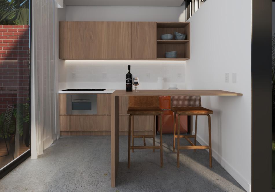 Os dois volumes retangulares simétricos foram posicionados de forma paralela e conectados por um corredor coberto por uma estrutura leve para setorizar as zonas social e íntima, ter uma continuidade da materialidade a partir do deck como entra da principal e conseguir maior iluminação e ventilação devido ao anexo estar posicionado nos fundos da casa. Pensado para um casal, o Airbnb impressiona pela conexão externa e interna