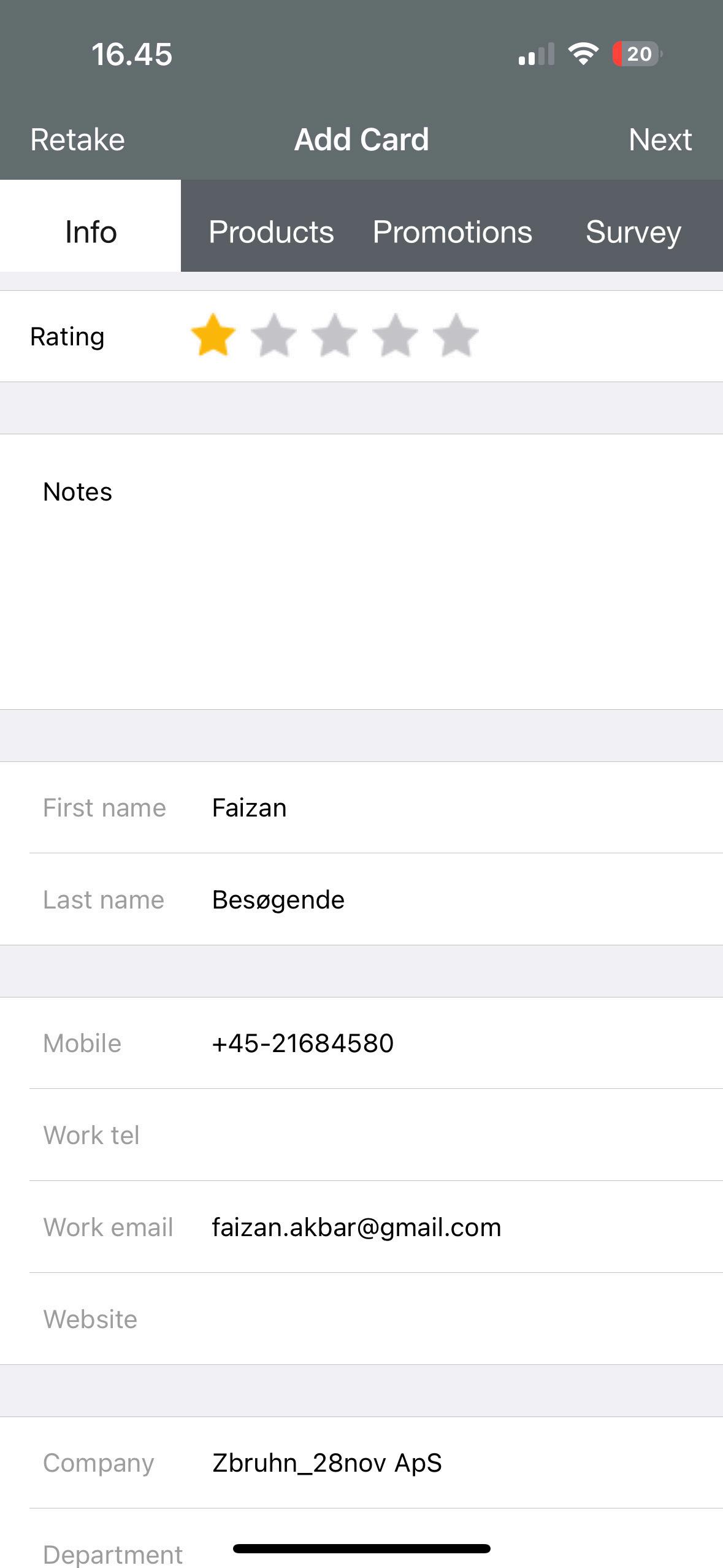 Still en tablet frem I “Scan lead” mode og lad din beøgende giv deres kontaktdata ved at ”swipe” deres navneskilt med QR-koden. Denne funktion kan med fordel benyttes når alle konsulenter er optaget på standen.