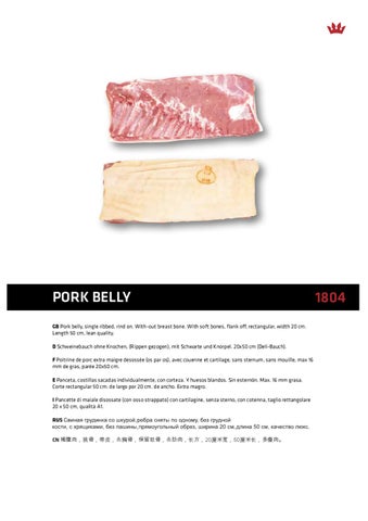 Pork Belly GB Pork belly, single ribbed, rind on. With-out breast bone. With soft bones, flank off, rectangular, width 20 cm. Length 50 cm, lean quality. D Schweinebauch ohne Knochen, (Rippen gezogen), mit Schwarte und Knorpel. 20x50 cm (Deli-Bauch). F Poitrine de porc extra maigre desossée (os par os), avec couenne et cartilage, sans sternum, sans mouille, max 16 mm de gras, parée 20x50 cm. E Panceta, costillas sacadas individualmente, con corteza. Y huesos blandos. Sin esternón. Max. 16 mm grasa. Corte rectangular 50 cm. de largo por 20 cm. de ancho. Extra magro. I Pancette di maiale disossate (con osso strappato) con cartilagine, senza sterno, con cotenna, taglio rettangolare 20 x 50 cm, qualità A1. RUS CN 猪腹肉,挑骨,带皮,去胸骨,保留软骨,去肋肉,长方,20厘米宽,50厘米长,多瘦肉。