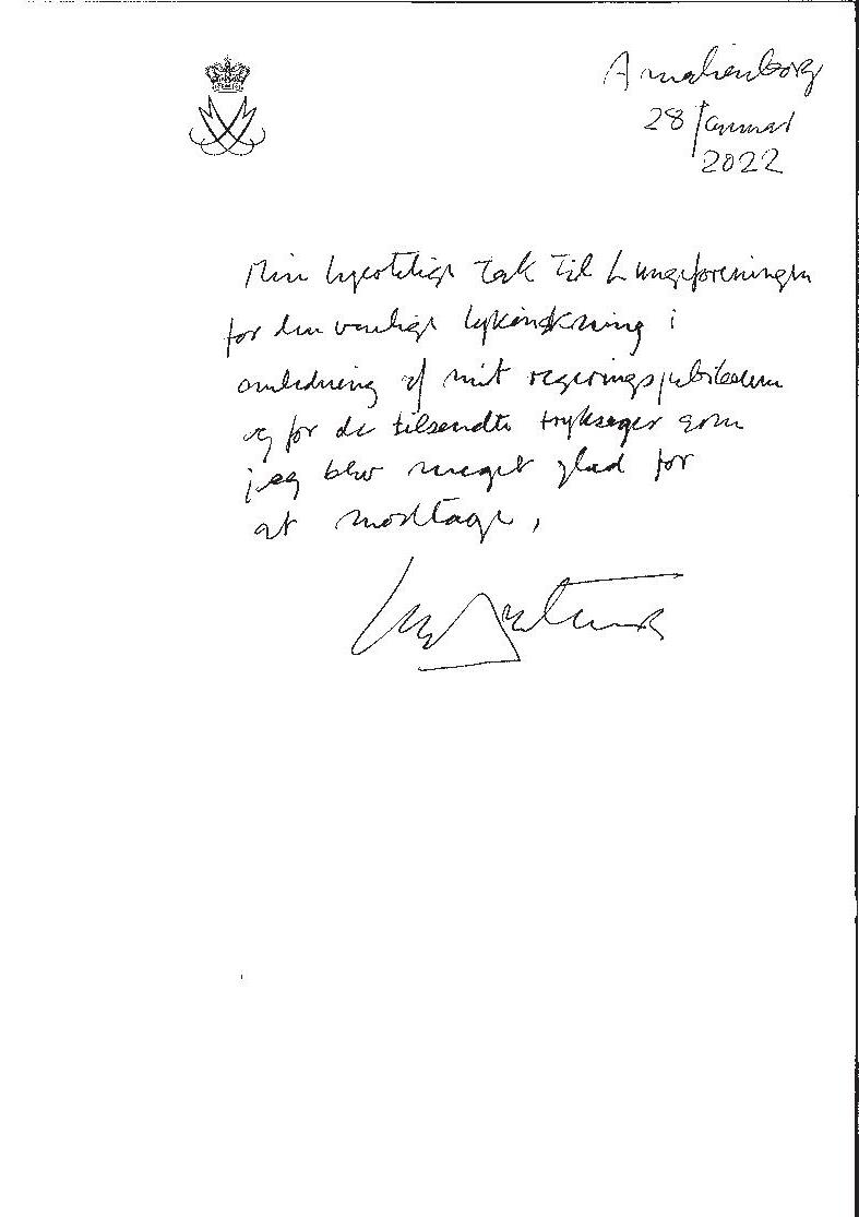 Et stort tillykke til Majestæten Samarbejdet med Kongehuset er enormt værdifuldt. Derfor var det også vigtig for Lungeforeningen at vise Dronning Margrethe vores taknemmelighed og ønske hende stort tillykke med de 50 år som rigets regent. Derfor tog Lungeforeningens direktør Anne Brandt og administrations og udviklingschef Matilde Rømer turen forbi Amalienborg og afleverede en lille opmærksomhed. En opmærksomhed der aff ødte et flot takkebrev fra vores monark. Lungeforeningen glæder sig til mange års fortsat samarbejde med Kongehuset.