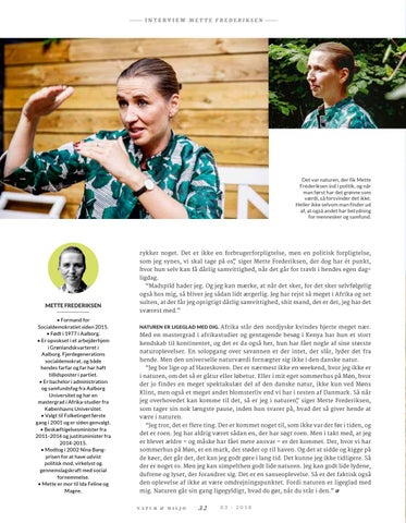 Med en mastergrad i afrikastudier og gentagende besøg i Kenya har hun et stort kendskab til kontinentet, og det er da også her, hun har fået nogle af sine største naturoplevelser. En solopgang over savannen er der intet, der slår, lyder det fra hende. Men den universelle naturværdi fornægter sig ikke i den danske natur. “Jeg bor lige op af Hareskoven. Der er nærmest ikke en weekend, hvor jeg ikke er i naturen, om det så er gåtur eller løbetur. Eller i mit eget sommerhus på Møn, hvor der jo findes en meget spektakulær del af den danske natur, ikke kun ved Møns Klint, men også et meget andet blomsterliv end vi har i resten af Danmark. Så når jeg overhovedet kan komme til det, så er jeg i naturen,” siger Mette Frederiksen, som tager sin nok længste pause, inden hun svarer på, hvad det så giver hende at være i naturen. “Jeg tror, det er flere ting. Der er kommet noget til, som ikke var der før i tiden, og det er roen. Jeg har aldrig været sådan en, der har søgt roen. Men i takt med, at jeg er blevet ældre – og måske har fået mere ansvar – er det kommet. Der, hvor vi har sommerhus på Møn, er en mark, der støder op til haven. Og det at sidde og kigge på de køer, der går der, det kan jeg godt gøre i lang tid. Det kunne jeg ikke tidligere. Så der er noget ro. Men jeg kan simpelthen godt lide naturen. Jeg kan godt lide lydene, duftene og lyset, der forandrer sig. Det er en sanseoplevelse. Så er det faktisk også den oplevelse af ikke at være omdrejningspunktet. Fordi naturen er ligeglad med mig. Naturen går sin gang ligegyldigt, hvad du gør, når du står i den.” NATUR & MILJØ