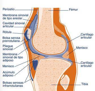 Cavidad articular: Es el espacio comprendido entre las superficies articulares de los huesos. Está limitada por la membrana sinovial y llena de líquido sinovial. A veces puede estar dividida, total o parcialmente, por discos y meniscos articulares.