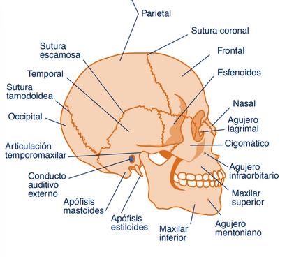 Huesos de la cráneo: Son los encargados de proteger el encéfalo y otras estructuras próximas, como los ojos y los oídos. Se incluyen 8 huesos: 1 frontal, 2 temporales, 1 occipital, 1 etmoides y 1 esfenoides.