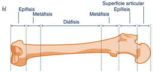 Desde el punto de vista macroscópico, todos están constituidos por: EPÍFISIS o extremidades (proximal y distal). Generalmente son anchas y voluminosas para facilitar la articulación entre los huesos y proporcionar una mayor superficie para las inserciones musculares. Están constituidos por tejido óseo esponjoso y recubiertas por cartílago articular.