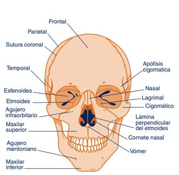 Huesos de la cara: Se unen a los huesos del cráneo para constituir y limitar la cavidad craneal. Comprenden 14 huesos: 2 nasales, 2 maxilares superiores, 2 palatinos, 2 cigomáticos o molares, 2 lacrimales, 1 vómer, 2 cornetes inferiores y 1 maxilar inferior.