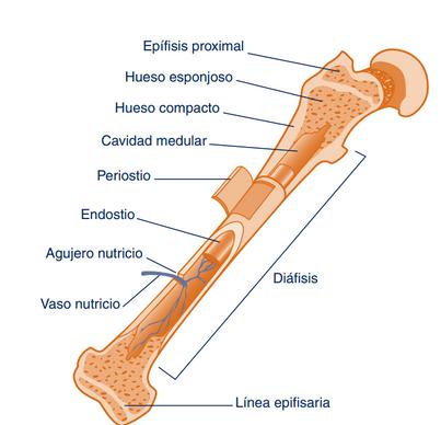 DÍAFISIS cuerpo o parte central de los huesos. Presenta un aspecto tubular y está formada por tejido óseo compacto que rodea a la cavidad central o medular, en cuyo interior se aloja la médula ósea. Esta cavidad está rodeada está rodeada por una vaina externa de tejido conjuntivo o periostio, y otra interna de características similares o endostio.
