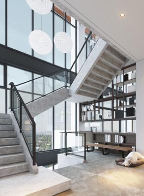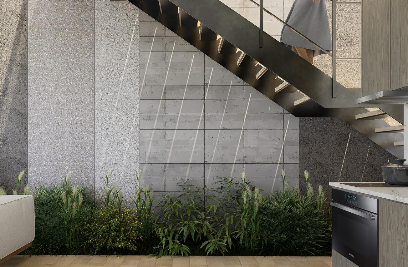 The stairway is airy and visually connects to the back of the house. Without a stringer, the lightness of the design creates a playful interaction with the textured feature wall, enhancing the overall aesthetic. This combination adds a sense of openness and charm to the space.