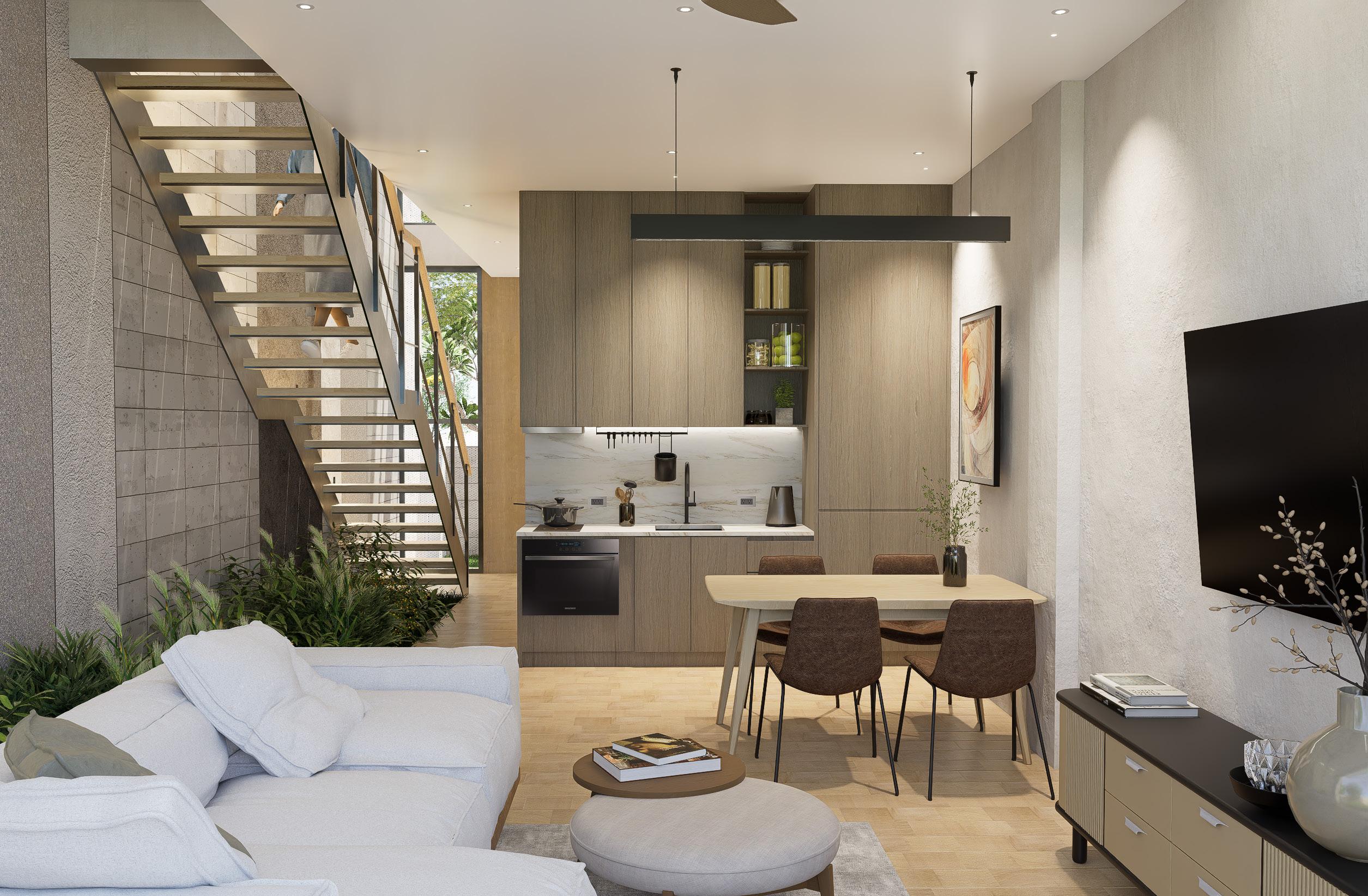 S Residence is a three-unit townhouse development designed as a rental investment. Situated on a compact lot, the layout prioritizes natural light through strategic window placement and a central skylight, creating bright, livable interiors despite the limited space.
