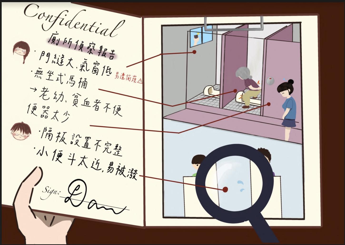 要形象,因為會比較生動有趣。我們想呈現的出的形象是偵查檔案夾的內頁,為了凸顯友善廁所的弊端以及偵探機 密文件的神秘感,所以我們選擇了灰調的顏色來作為背景,接著加入偵探的元素讓圖表更貼近主題。圖表右側男廁 和女廁的透視圖,左側條列式列出男廁和女廁的缺失,除了列點出來的重點部分外,我們也在圖裡加入很多細節, 像是溼地板縫顏色會比較深、牆壁有淺淺的黃色污漬等等。男女廁的配色也是參考現實廁所的顏色,大部分地方的