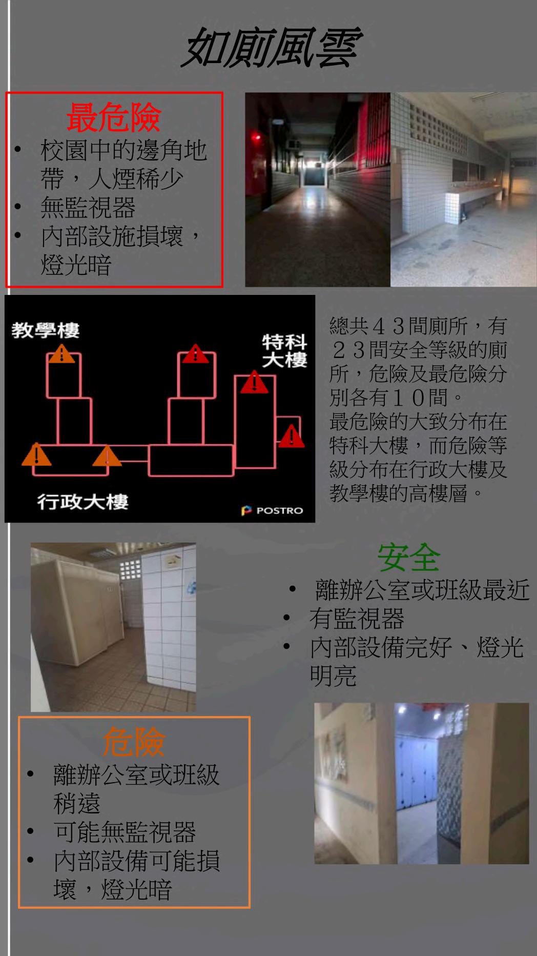 廁所風雲 新莊高中廁所危險地圖 設計語彙 在廁所裡常常會有未知的危機,例如說:廁所濕滑,導致不小心滑倒,抑或 是坐落在某陰暗處的廁所成了治安或安全的死角。風雲兩字,會使人感覺到 一股無法預測甚至是一股莫名的危機感,因此,我們想藉由我們的主題—廁 所,再加上這個「風雲」兩個字,希望能喚起讀者對廁所的所隱藏的危機有 所關注。 內容說明 內部我們分了三個等級,分別為安全、危險、最危險,三個等級,分類的標 準為(1).監視器的有無(2)設備有無損壞(3)所在位置的遠近(以所在位置與川堂 的遠近加上該所在地點平時人流多寡),三項條件,而安全是於上述條件中沒 有缺失的;危險的為符合上述1~2項;最危險的為符合上述三項危險條件。 我們所統計出來,安全的佔23/43; 危險的佔10/43; 最危險 10/42,且根 據這份資訊,我們發現這些廁所分別在各棟的四樓以上,出乎我們的意料, 沒想到在人流最常往來的行政大樓,原本以為是最安全的,竟然也有著最危 險等級的廁所。 二年二班 23方承廷 、25林羿辰 、29莊幃傑、32黃奕勳 19