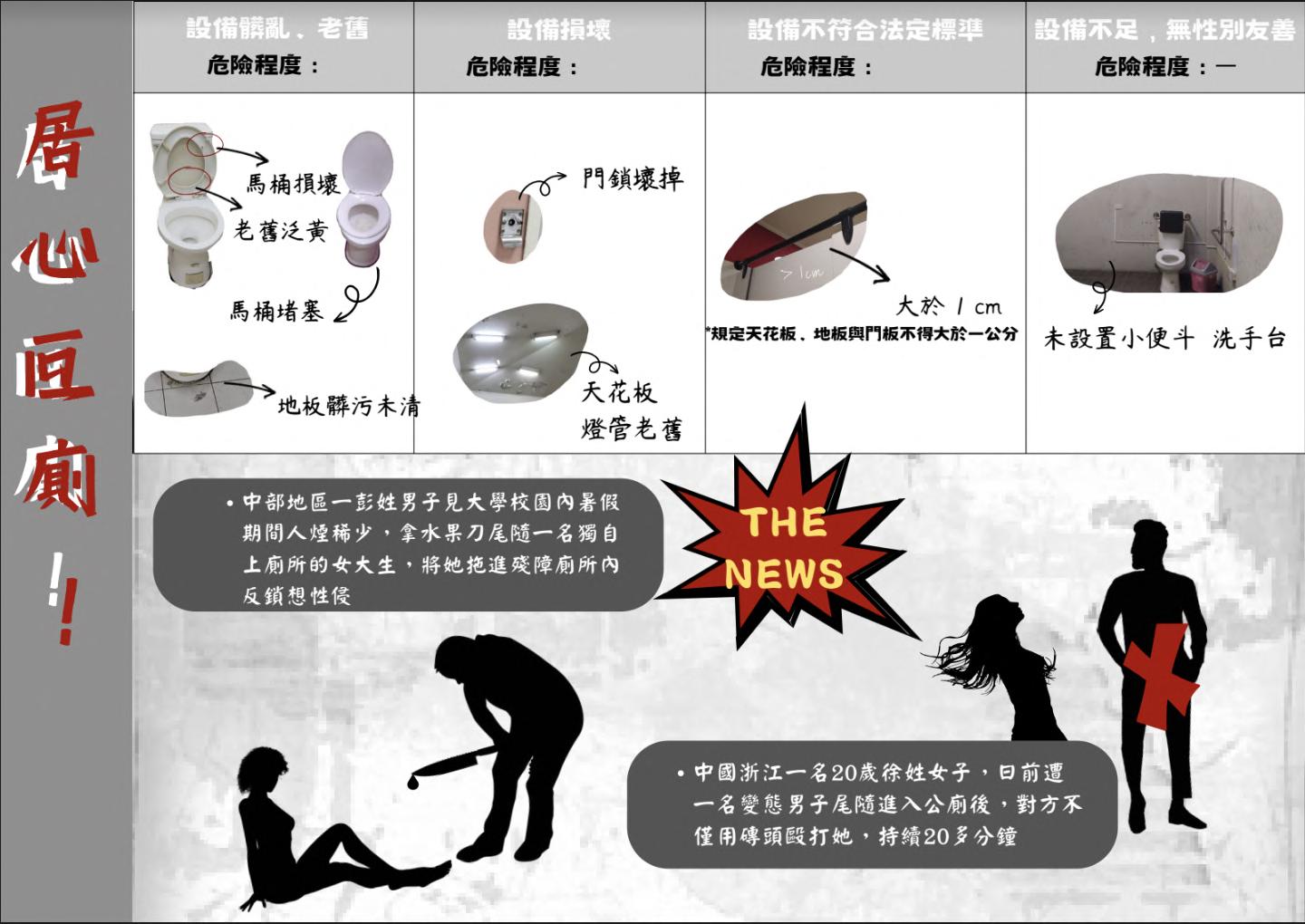 居心叵廁 現行公廁的潛在危險探究 設計語彙 現在的公廁有許多意想不到的危險發生,像是天花板的破洞、電線外露、地板太滑都會有安全上的隱患。有關女性 在公廁遇到變態而發生侵犯等議題近年來層出不窮,其發生機率更是有家用廁所女性的兩倍。使用戶外公廁固然可 以立即解放也十分方便,可一旦有心人圖謀不軌或是在廁所發生意外而導致身亡,那將造成終生遺憾。 內容說明 現代公廁的問題: 1. 廁所環境髒亂:有異味(整體or馬桶本身);馬桶上有血漬、尿液、鞋印等等 廁所環境髒亂、潮濕、無定時清潔等因素都會導致廁所這個原本就容易有細菌的地方滋生大量病菌,變成疾病 的溫床,不只在馬桶上,門把手、水龍頭等等地方都可能,因此,公廁定時的清潔、保持通風是極為重要的 2. 安全性疑慮 門板與天花板、地板空隙太大,有偷拍疑慮;門鎖老舊、損壞 廁所門鎖壞掉,造成隱私問題,可能會在如所過程中被他人誤入,也有可能因為門鎖老舊導致民眾在使用後被 困在廁所裡面。有些公廁門板與天花板、地板間留有比較大的空隙,容易讓偷拍的人有可稱之機,也已經有蠻 多案例。 3. 友善性不足 有些沒有設置親子廁所、無障礙廁所、沒有附衛生紙、蹲廁沒有安裝扶手 4. 設施老舊 燈光照明不足、照明設施損壞卻沒有人換、踏板無法沖水、門鎖壞掉、馬桶堵塞等等 二年二班 01方柏臻、02王若宇、07林妍玲、11柯懿嶸、26邱宇廷、27柏廷 06