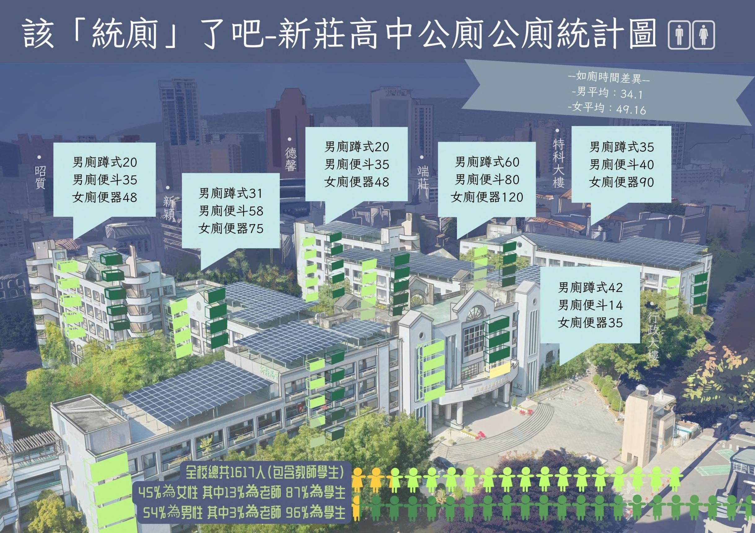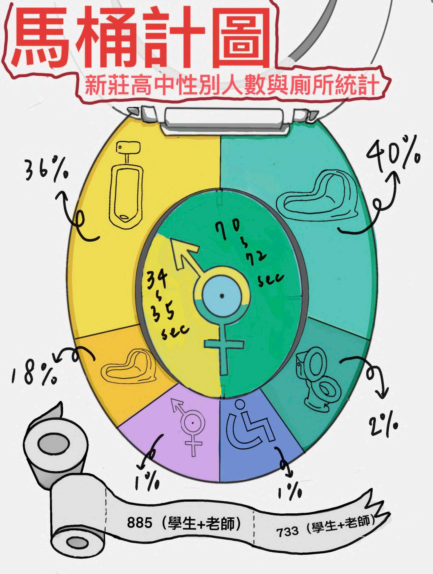 內容說明 根據吳明修(2012)指出,在2003年台灣衛浴文化協會作了台灣 男女生小便時間之調查,結果為女生上小便時間為70~72秒,而 男生約34~35秒,之中的時間相差兩倍。在111年新莊高中的在校 人數統計中,目前在學人數的生理性別之男女比例為:男生851 人、女生638人;而教職員的的生理性別之男女比例為:男生34 人、女生95人。而根據111年新莊高中的空間配置統計,男廁的小 便器有313個、大便器共有157個,而據我們調查其中有8個為坐 式馬桶;女廁共有432個,其中的坐式馬桶有21個;無障礙廁所有 12間;友善廁所有9間,其中有3間為小便器、2間坐式馬桶、4間 蹲式馬桶。