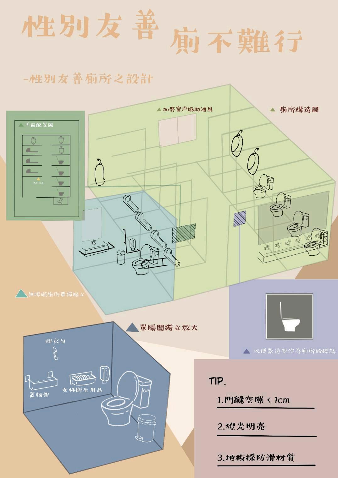 內容說明 性別友善廁所隨著時代變遷、性別平等意識的提升以及許多學者的戮力 提倡,於多年來,逐漸 被人重視,對於空間上的安排,希冀能使得如廁 空間更加安全以及更加妥善運用;對於使用者 而言,希冀能多方面考量不 同族群的需求(例:LGBT、身障人士和其照顧者、親子、喜愛中 性穿著 者等等)以達提升如廁品質和心情。 這張資訊主要以性別友善為主軸, 並以文青風格呈現,並重視通風設備是否良好、地板材質是 否防滑以及 動線與隔間設計、使用者隱私、基本衛生用品的提供、供給物品擺放的 設備等等。 首先,根據卡洛琳.克里亞朵.佩雷茲(2020),女性如廁時間為男性的2.3 倍,因此,特別將小便斗設定數量為2、蹲、坐式便器各設定為4個,盡 可能地符合及改善上述資料顯示情況和不便之處。此外,根據內政部建 築研究所委託研究報指出廁所左右隔間的上下通風 處,若距天花板與地 面大於1cm時,偷窺風險易增加,故本組將此空間設計小於1cm。其 次,於廁內增設置物架並放置女性生理用品、 基本衛生用品,以便使用 者放置物品和滿足基本衛生需求,避免如廁者過度擔憂。最後,地板採 取防滑材質,保障使用者安全。