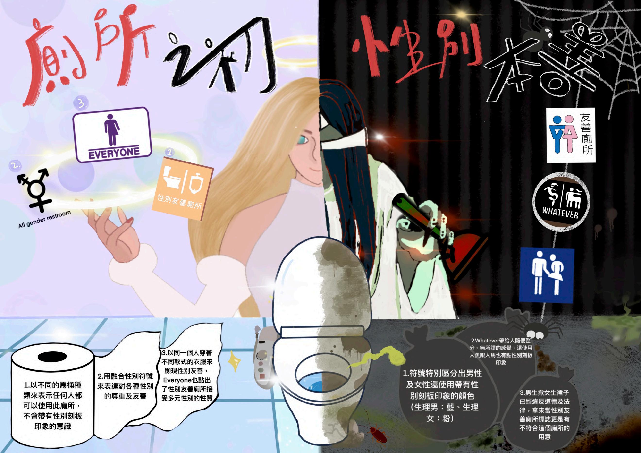 廁所之初,性別本善 公共廁所潛在的性別符碼 設計語彙 本資訊圖表以中央設計的一名廁所守護神為主軸,以中線區隔左右兩區分別為乾淨明亮、髒亂陰暗的廁所環境分別 帶出我們比較的性別友善廁所標誌設計,使讀者明白廁所標誌設計也有好壞優缺之分。左右兩半邊的標誌皆是我們 從各文獻資料、實地勘察所尋找到的結果,加上條列式我們統整觀察後發現的優缺點是否違反性別友善理念的初 衷,(例:部分性別友善廁所的標誌依然使用紅藍配色、特定族群標誌性仍明顯;有些標誌正確傳達理念則使用黃 棕紫綠等中性色;亦有些直接使用便器標誌顯示,直接消弭了男女廁的界線。)。廁所守護神就如同廁所標誌的執 法者,懲罰帶有刻板歧視意味的廁所以及如廁者,使廁所呈現黑暗色調、如深淵般的效果,擁有合乎預期的性別友 善標誌(左半邊)則是舒適、光明透著聖光的感覺。 內容說明 現在性別平等的意識抬頭,為了創造更包容的環境並鼓勵多元意識的普及和對個體差異的尊重,因此多了很多性別 友善廁所,其中性別友善廁所的標誌是一個很大的重點,有些打著性別友善的名但還是隱含了性別刻板印象,有些 就有成功把性別友善的理念傳達出來,此圖表我們詼諧地使用廁所守護神的明暗兩面比較生活中的性別友善廁所標 誌的優點及缺點,哪些是我們覺得很成功,哪些是我們覺得還存在著刻板印象的,以及我們自己設計或參考網路上 優秀的標誌設計。 二年四班 02王彥筑、16陳靜怡、20魏瑄萱、21蘇寗媛、32蕭家笙、34蘇義翔 20
