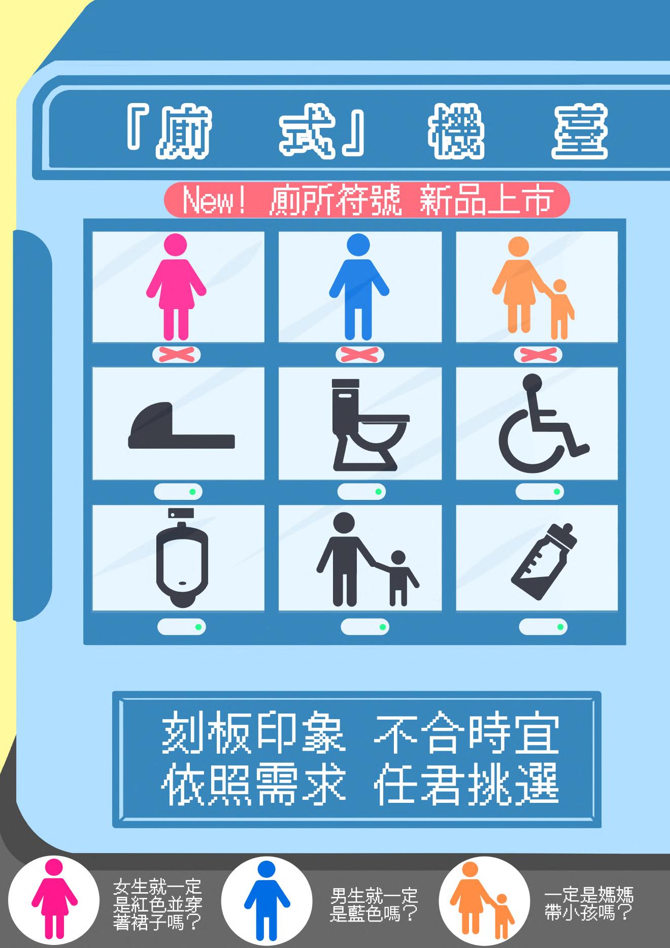 廁式機台 公共廁所潛在的性別符碼 設計語彙 1. 設計理念:現今的販賣機不再只是販賣飲料食品,可以有各式各樣的商品,因此我們以販賣機的形式販售廁所 符號,在這台販賣機中,有舊的廁所符號也有新的廁所符號,舊的符號打叉,表示已售完,也代表他已不合時 宜,新的廁所符號則直接表示使用功能,使用者可選擇他所想要的。整個版面使用明亮色系,讓人有較為輕鬆 之感,意味著希望大家在如廁時都能有愉悅放鬆不具有壓力的心情。下面小圖示則說明符號刻板印象之原因, 以及我們的標語。 2. 命名動機:我們決定以販賣機作為我的設計主體,因此我們決定以「測試機台」的諧音作為圖表的標題,表示 出它作為新產品需要進行測試,並且將「測試」改成「廁式」可以讓閱讀的人明確地瞭解這張圖表的主題, 「機台」兩字也扣合了作為設計主體的販賣機。 二年二班 09林庭萱、10姚宜廷、17曾筱雯、19楊育萱、21顏綺誼 22