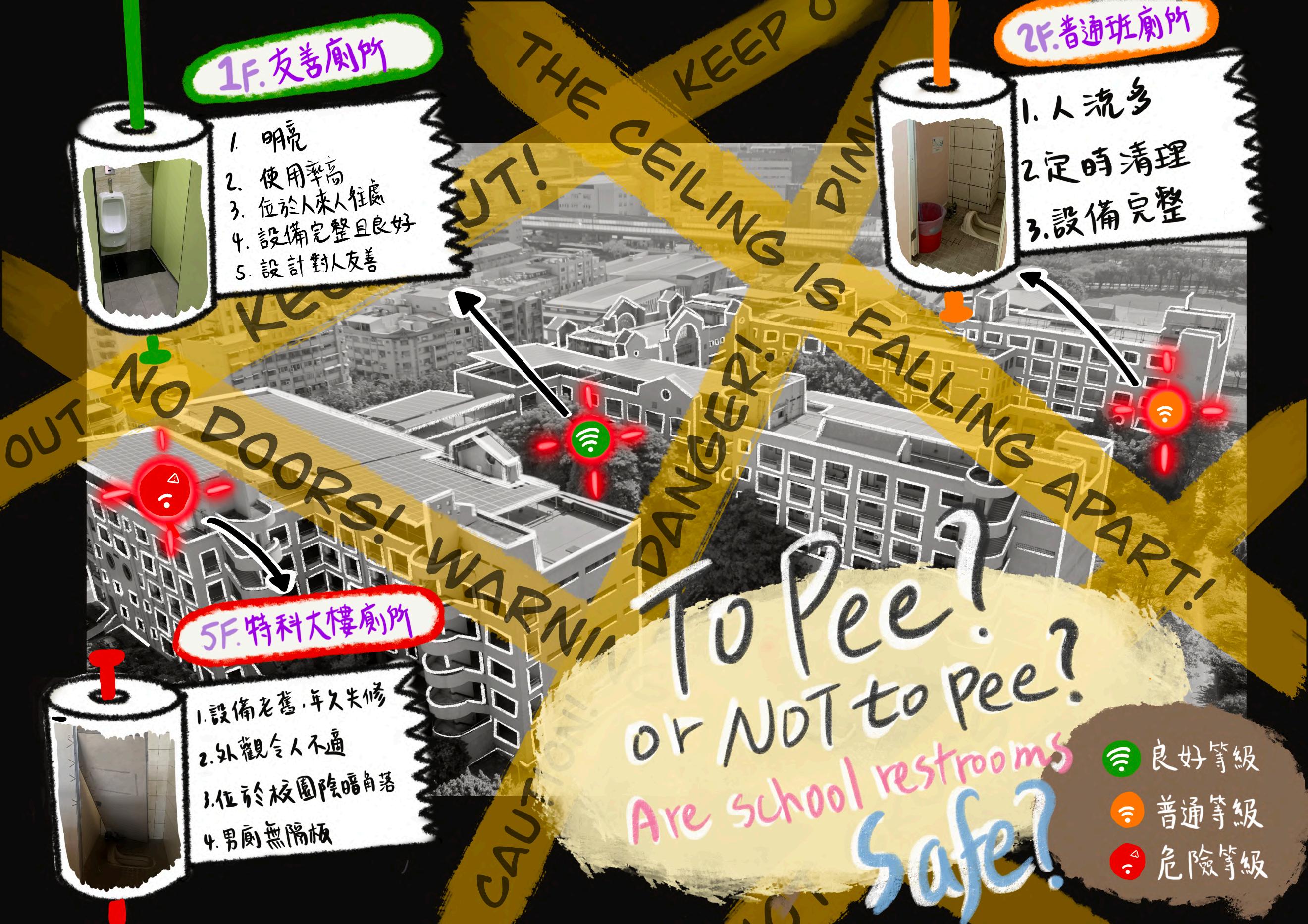 To pee or not to pee, are school restrooms safe? 新莊高中廁所危險地圖 設計語彙 1. WiFi訊號強弱程度:我們利用新莊高中的空拍圖來描邊,並且標示出我們要比較的 三所廁所,用WiFi的訊號以及顏色來表示各間廁所的危險程度。訊號微弱我們用紅 色來表示代表廁所黑暗、設備失修且鮮少人使用;訊號中等我們用橘色來表示代表 使用率高且設備完整;訊號良好我們用綠色來代表廁所明亮、人多且對使用者友 善。 2. 捲筒衛生紙:我們將要比較的廁所用上述所設計的圖示標示並出來拖曳出來,接上 一個捲筒衛生紙,把捲筒衛生紙拉出一張衛生紙寫出該廁所的優缺點,寫出為什麼 它會被我們放在這個等級,並且在捲筒上放上該廁所的照片。值得注意注意的是, 照片的明暗程度反映出廁所的光線是否充足,正好和旁邊我們對於該間廁所的描述 做一個呼應。而捲筒衛生紙掛勾的顏色也是隨著廁所的訊號等級做改變,我們所認 為最危險的廁所使用紅色;中等程度的使用橘色;我們認為最安全的廁所則是使用 綠色。 3. 封鎖線:在圖上佈滿的封鎖線則是搭配我們的資訊圖表的副標題「Are school restrooms safe?」,究竟廁所是安全可以上的嗎?黃色則是 有警示的意味。上面的英文標語則是我們所觀察到的一些危險廁所中會有的現象,例如我們發現學校有些廁所沒有門、人煙稀少等等⋯。 4. 命名理念:當我們去到一間廁所時,我們會因為那間廁所的衛生環境以及安全性而開始思考,究竟要不要在這邊上廁所呢?因此,我們將 莎士比亞的名著—哈姆雷特中的台詞「To be or not to be」改為「To Pee or Not to Pee」來作為我們資訊圖表的標題。為了突顯到底是要 上廁所還是不要上,我們把「To Pee」和「Not 」的開頭字母大寫來突顯出我們這個資訊圖表的主題。 二年四班 04余庭萱、11徐芷媛、12馬宜岑、14莊琇寓、26徐丞睿、28陳亮宇 16
