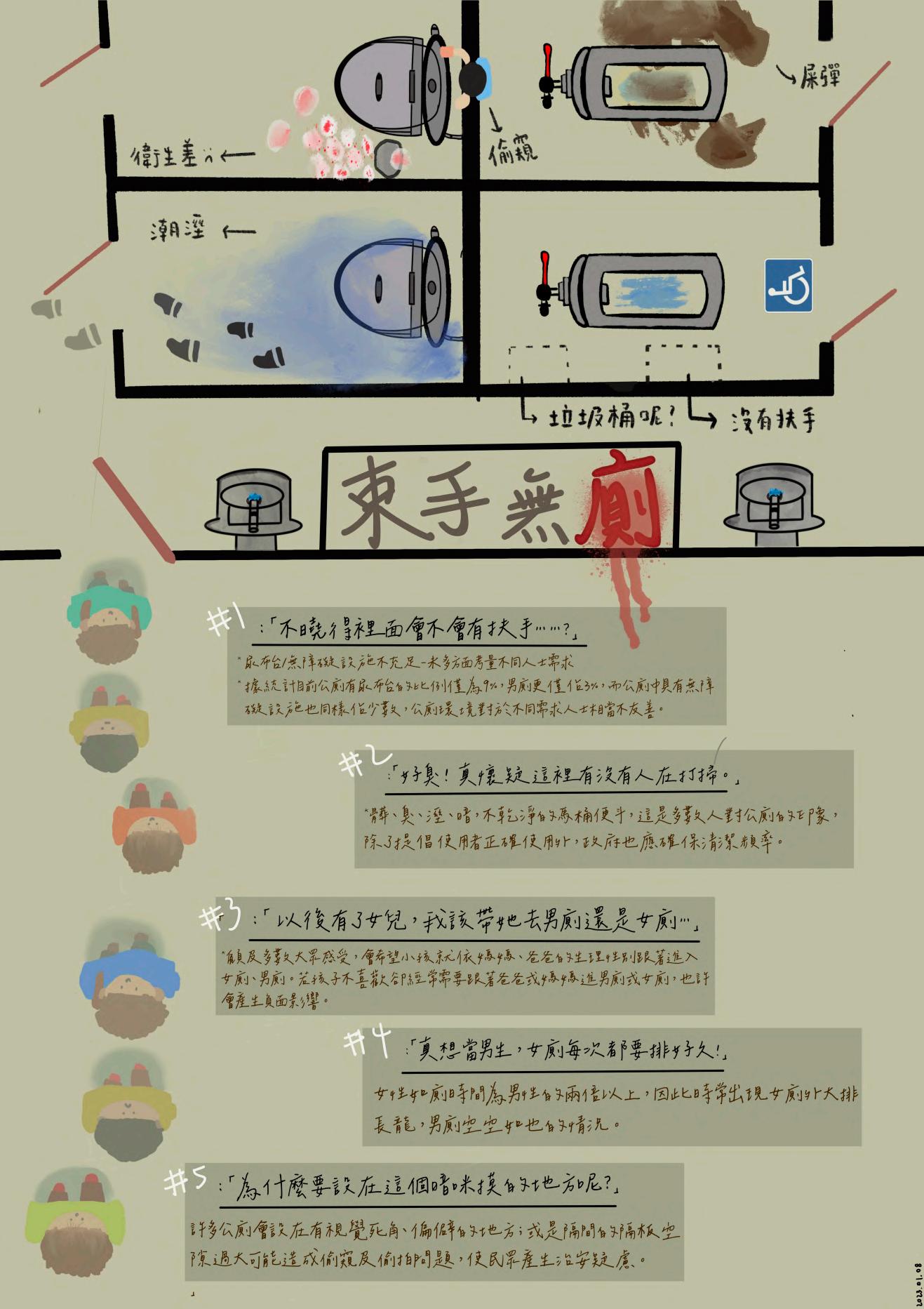 內容說明 此圖表中我們整理了五項公廁常見的問題。 1. 尿布台/無障礙設施不充足-未多方面考量不同人士需求 據統計目前公廁有尿布台的比例僅為9%,男廁更僅佔3%,而公廁中 具有無障礙設施也同樣佔少數,公廁的育兒集無障礙環境對於不同需 求人士可以說是相當不友善。 2. 衛生程度:髒、臭、亂 使用者評分公廁乾淨指數為5.5分,髒、臭、濕、暗,不乾淨的馬桶 便斗等問題,是多數人對公廁的印象,除了提倡使用者正確使用、發 揮公德心外,政府也應確保清潔頻率。 3. 治安問題:位置陰暗偏僻 據觀察公廁大多設在有視覺死角、偏僻、孤立或路徑曲折的地方,入 口照明不足且隔間的隔板空隙過大,使⺠眾使用公廁常須冒著被偷窺 的風險,不禁對公廁產生治安疑慮。 4. 進廁所前的壓力「檢查性別」 媽媽帶兒子、爸爸帶女兒使用公廁時苦惱該往哪走的情況早已層出不 窮,顧及多數大眾感受,會希望小孩就依媽媽、爸爸的生理性別跟著 進入女廁、男廁。若孩子不喜歡卻經常需要跟著爸爸或媽媽進男廁或 女廁,也許會產生負面影響。 5. 男廁女廁空間分配不均 據統計,女性如廁時常為男性的兩倍加上各種因素,國⺠黨立委鄭正 鈐曾提出「公共場所廁所設置條例草案」,強調為保障女性友善如廁 環境,應規範男女廁所比例為1:5,但仍有多數公廁未採取此比例 規畫空間,導致女廁外大排長龍,男廁空空如也的情形仍常常出現。