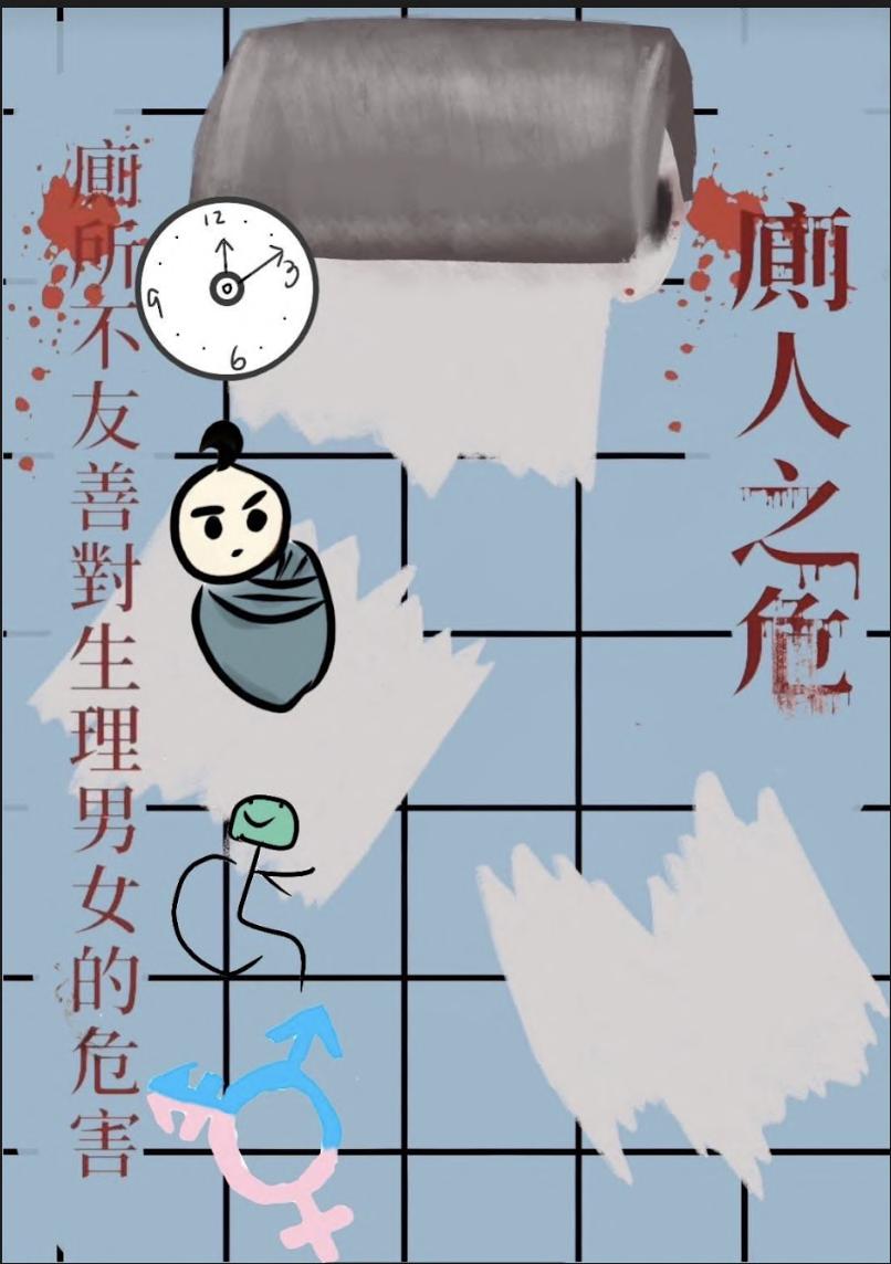 廁所女生都是紅色或粉色,男生則是藍色或綠色,間接反映出性別刻板印象的問題。 內容說明 依照主題,我們要探討的是不友善的廁所分別對男女性的潛在風險和影響,依此我們從廁所配置方面著手,並分析 不完整處會對男女性造成那些負面影響。 男: 1. 少數廁所隔板設置不完整隱私未受保障 2. 小便斗太近,沖水時易被潑到 女: 1. 有些廁所有門縫太大或氣窗太低,這樣很容易造成偷窺或偷拍 2. 由於女性如廁時間相較男性長,若便器太少容易造成女性排隊和憋尿的負擔 3. 無坐式馬桶造成老幼、貧血者不便 二年四班 13張紜寧、18葉湘云、19劉妤恩、29陳宥學、31蕭佑宸、33賴俊發 08