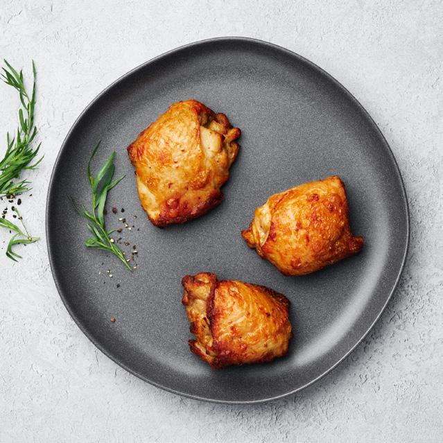 Tender and juicy deboned chicken thigh fillet with skin, delivering rich flavor and a delicious bite