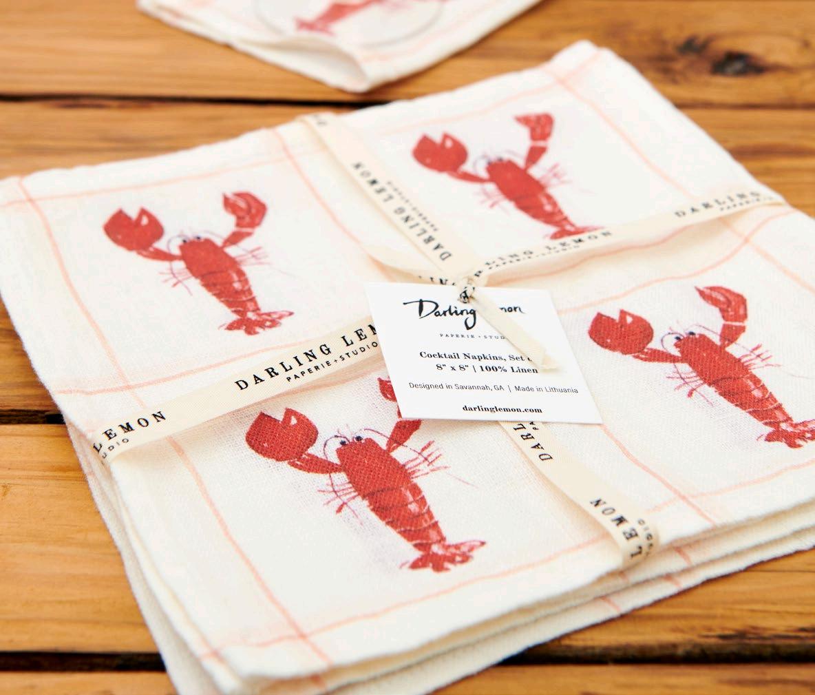 Inspired by cherries, martinis, and lobsters these cocktail napkins are perfect for any celebration. Packaged with a branded ribbon. $16 & min 4 per sku Designed in Savannah, GA | Made in Europe