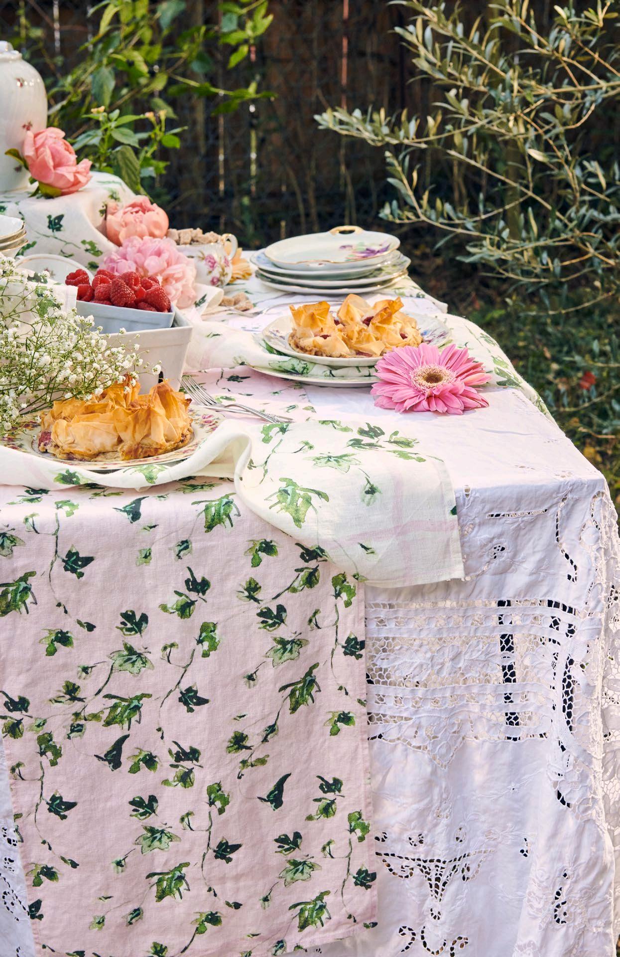 We’re also delighted to introduce “English Ivy,” a stunning celebration of lush ivy greenery. This design features a playful pink background on the table runner and pairs beautifully with coordinating dinner napkins, cocktail napkins, and a towel.