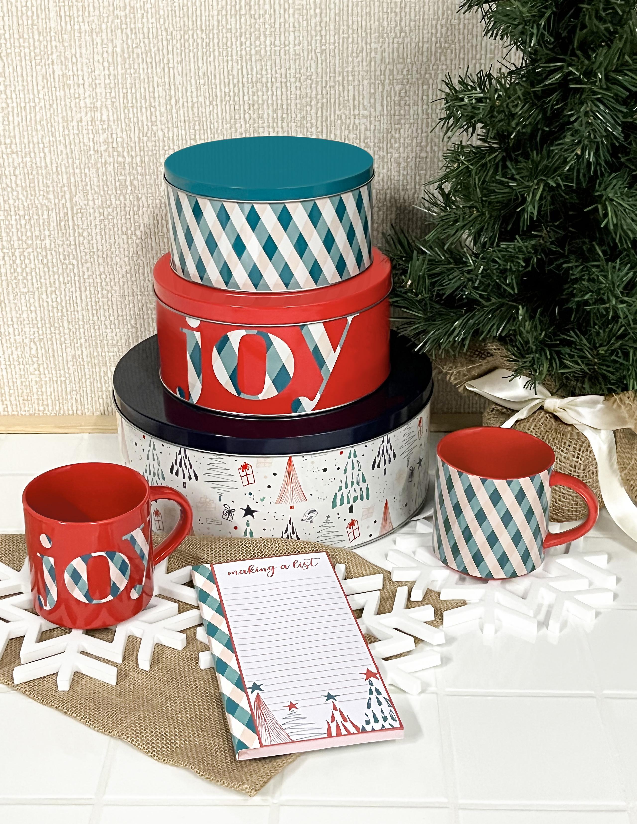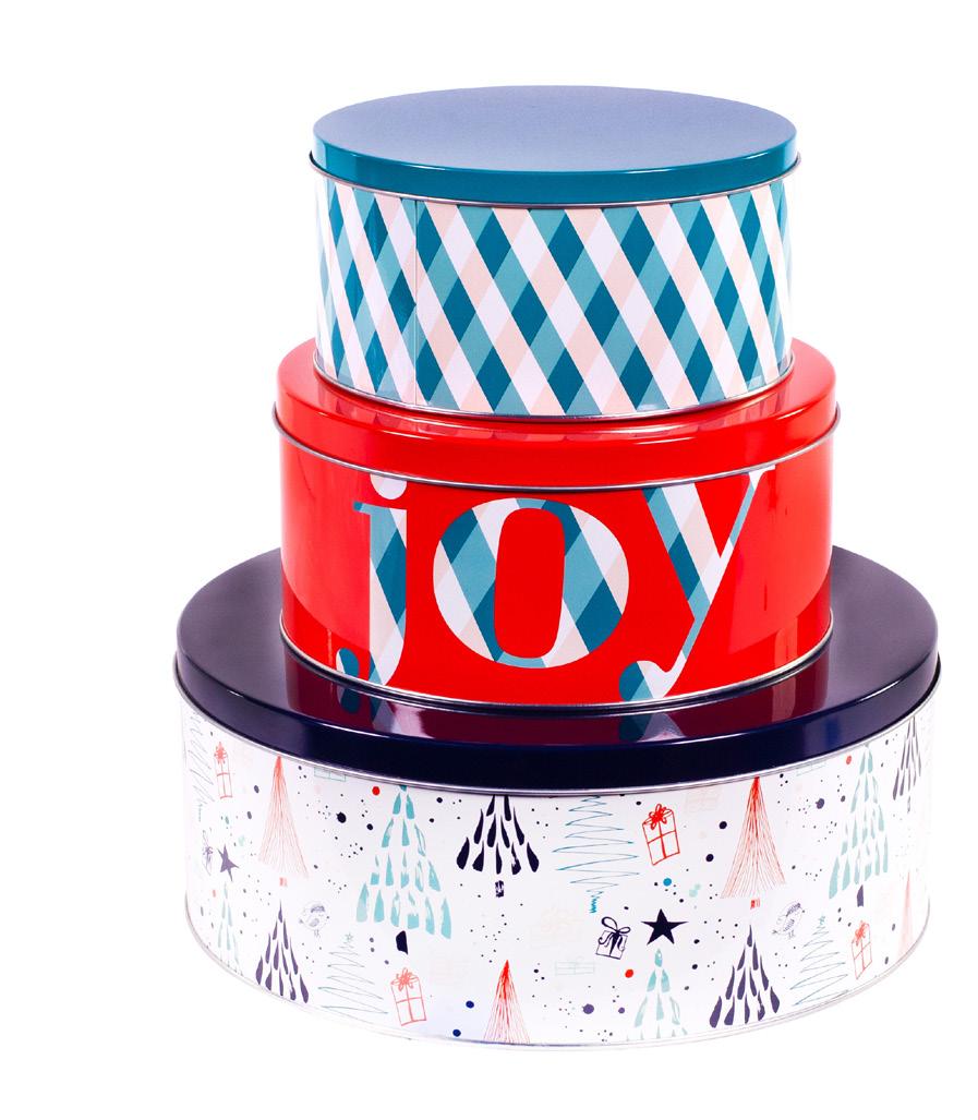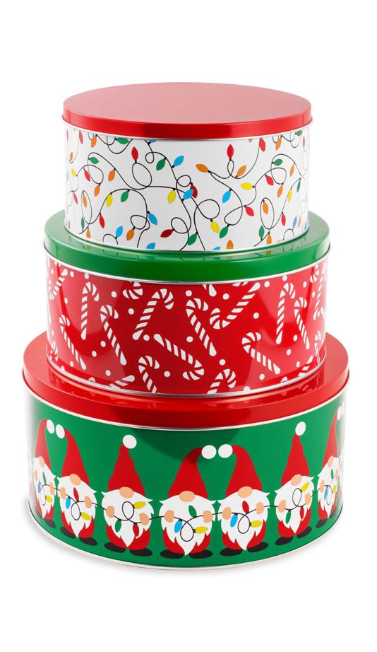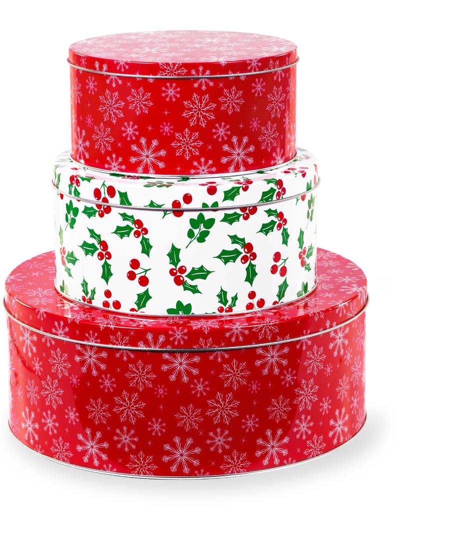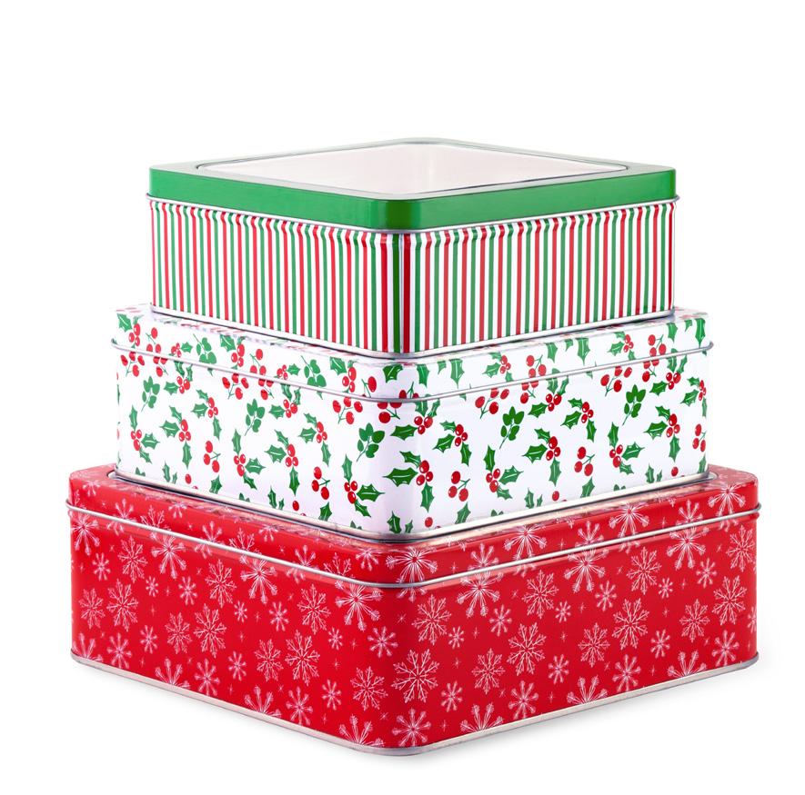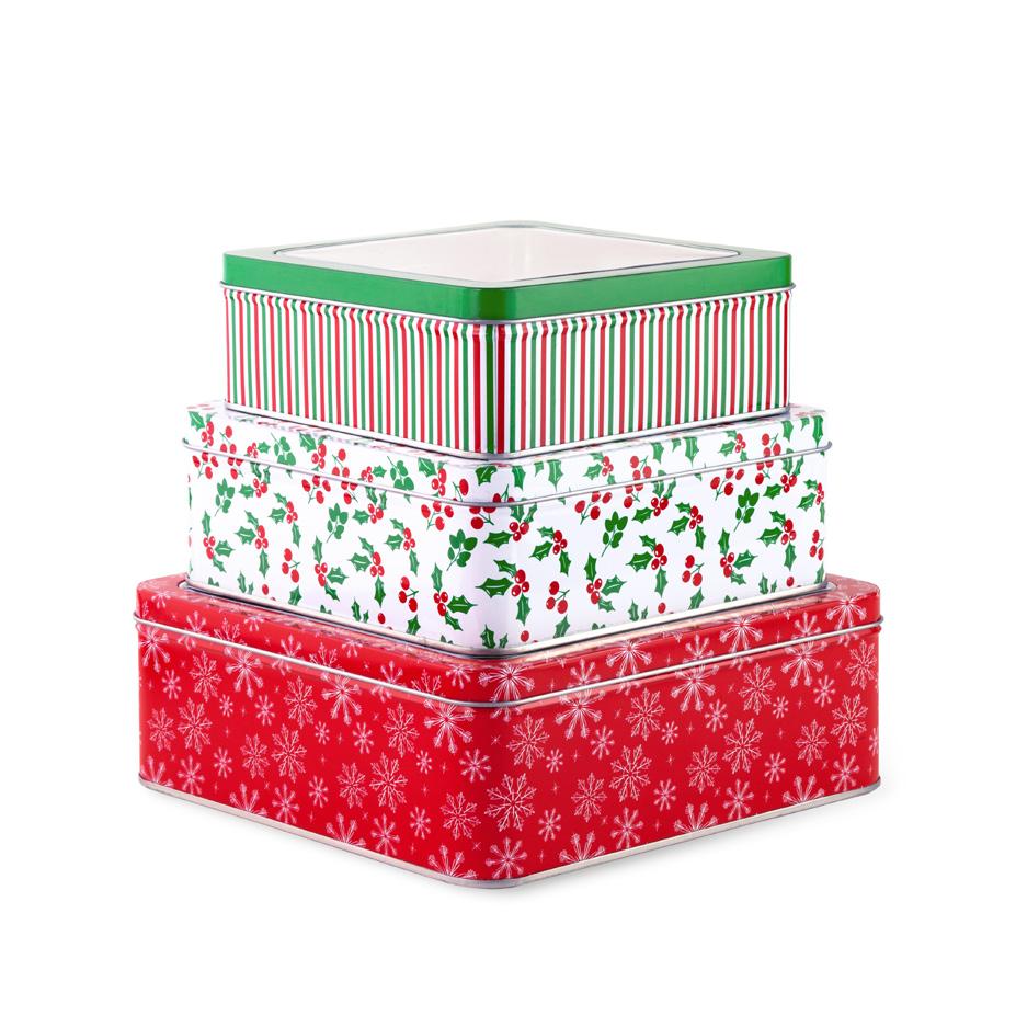 snowflake, holly & stripes square cookie tins set of 3 feature window in lid