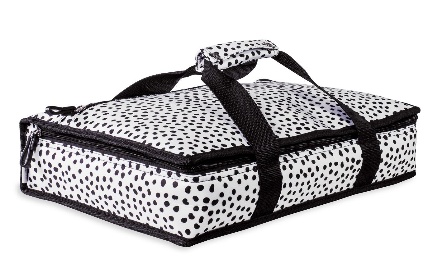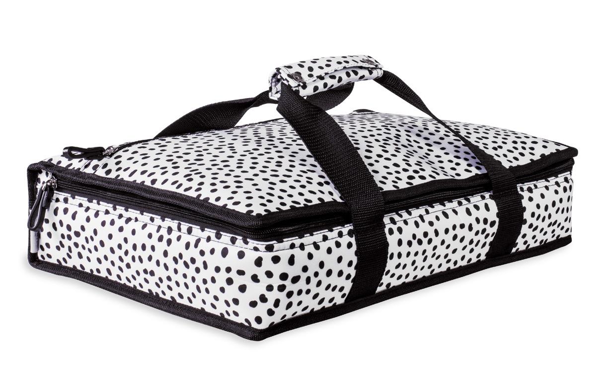 casserole carrier for hot and cold items holds up to a 13" x 9" dish zipper pocket on top spot clean 13”h x 18”w 1341