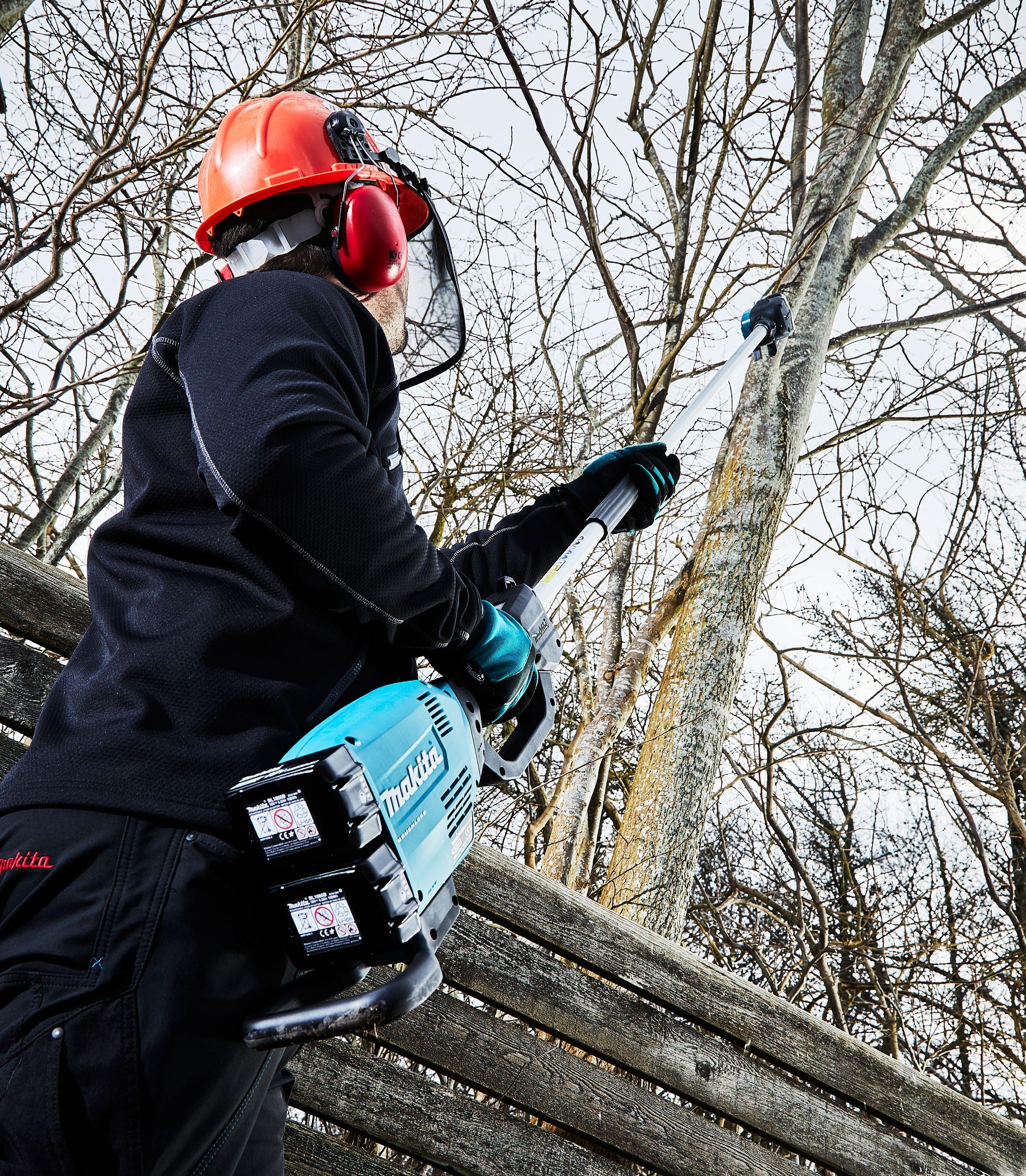 Akku hækkeklipper med kulfri motor og 750 mm super proff. kniv med nyudviklet skråtstillede knivblade, som fanger grene mere effektivt. To-hånds sikkerhedsafbrydere for ekstra sikkerhed. Lavt støjniveau. Med tre hastighedsindstillinger. Drejbart håndtag i 5 positioner. Lev. uden batteri og lader. DSN: 9411138