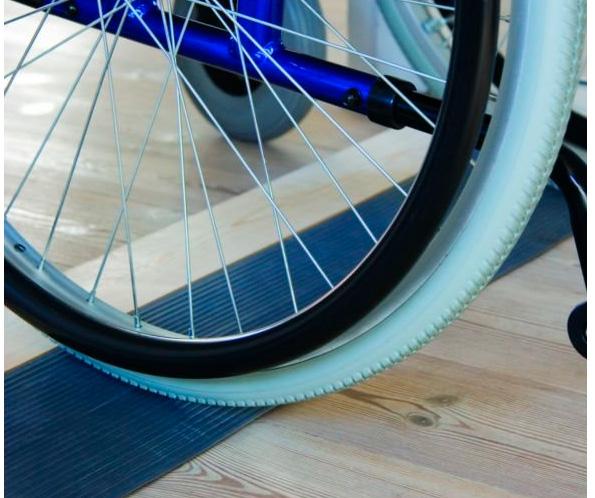 Køreplade i plast med skridhæmmende mønster og håndtag der letter håndteringen.