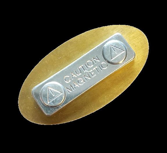 Navneskiltet sættes fast med magnet, så man undgår at lave huller i skjorte eller jakkesæt.