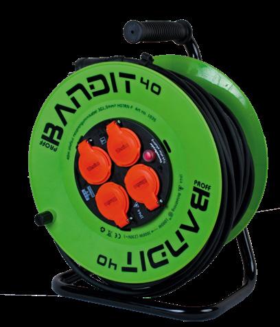 Wexim Bandit 40 kabeltromle – 40 m oliefast gummikabel (3x1,5 mm²) med jord. Udstyret med 4 stk. 230V/16A udtag med klaplåg, slagfast materiale og kapslingsklasse IP44. Indgår i Elretur-ordningen.