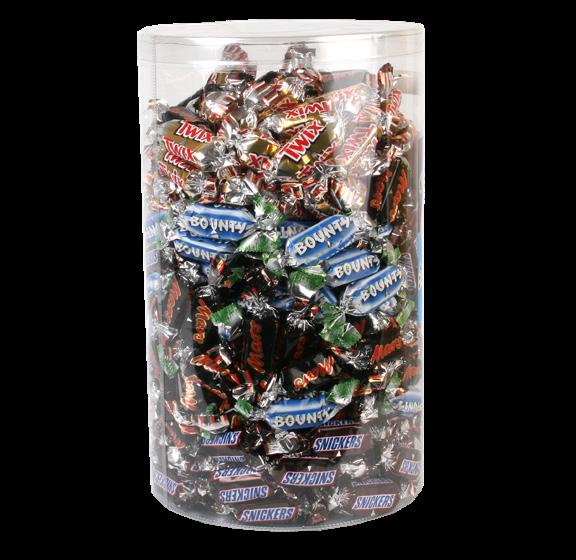 Stor bøtte med 3 kg små, individuelt indpakkede chokolader, perfekt til kirkelige møder, kirkekaffe og sociale sammenkomster. Blandingen indeholder klassikerne Mars, Twix, Bounty og Snickers, så der er noget for enhver smag.